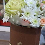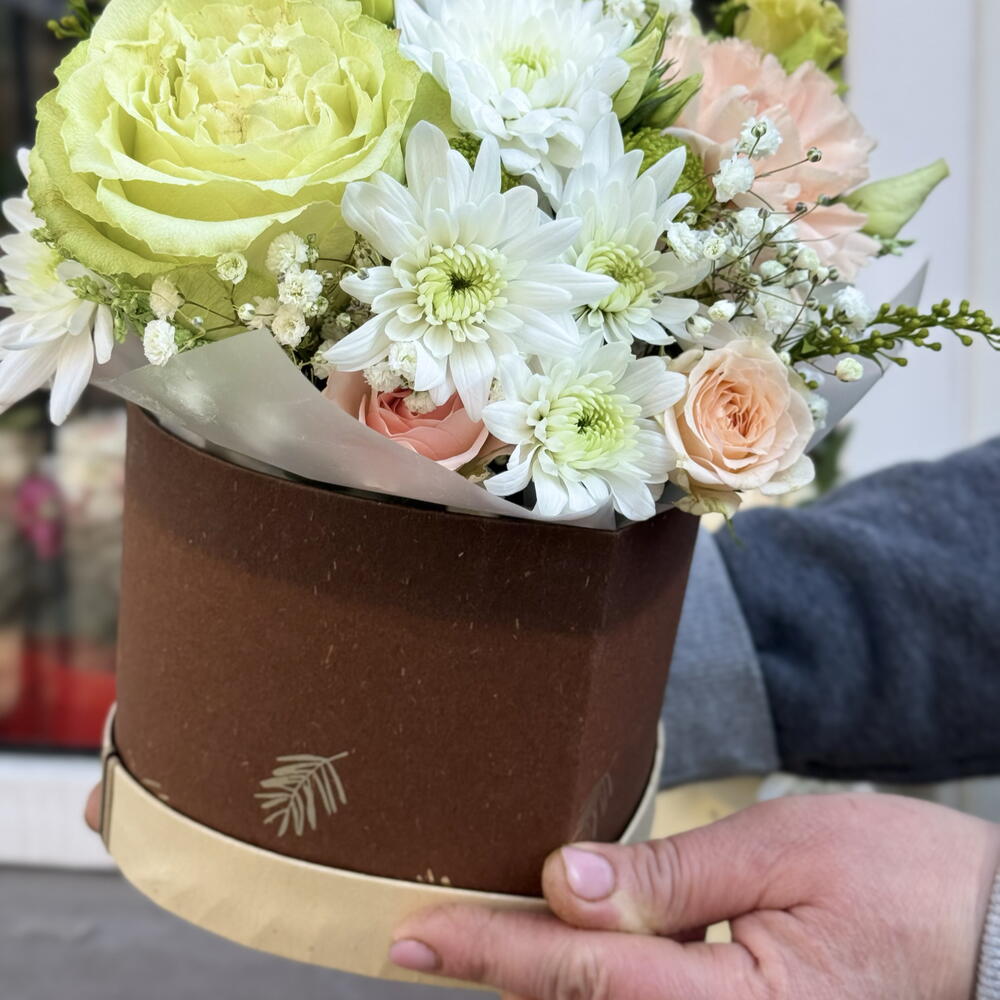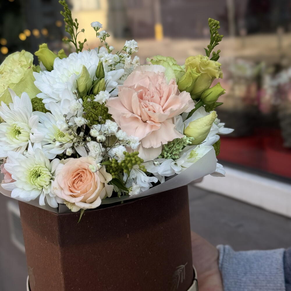 Eustoma - 1 pcs Chrysanthemum - 2 pcs rose - 2 pcs carnation - 1 pcs gypsum flower - 1 pcs decorative greenery - 2 pcs