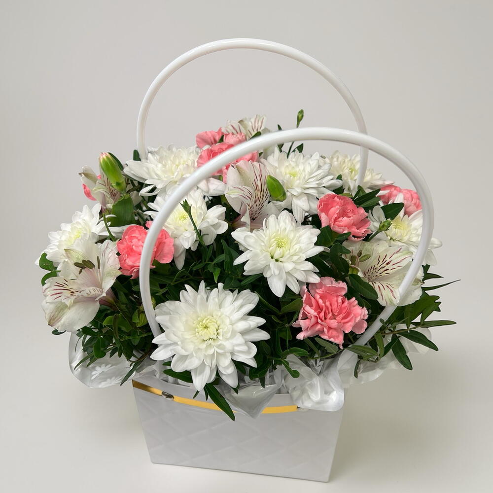 Chrysanthemum - 1 pcs alstroemeria white - 1 pcs bag or box - 1 pcs carnation pink spray - 1 pcs