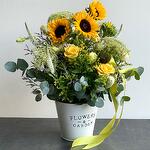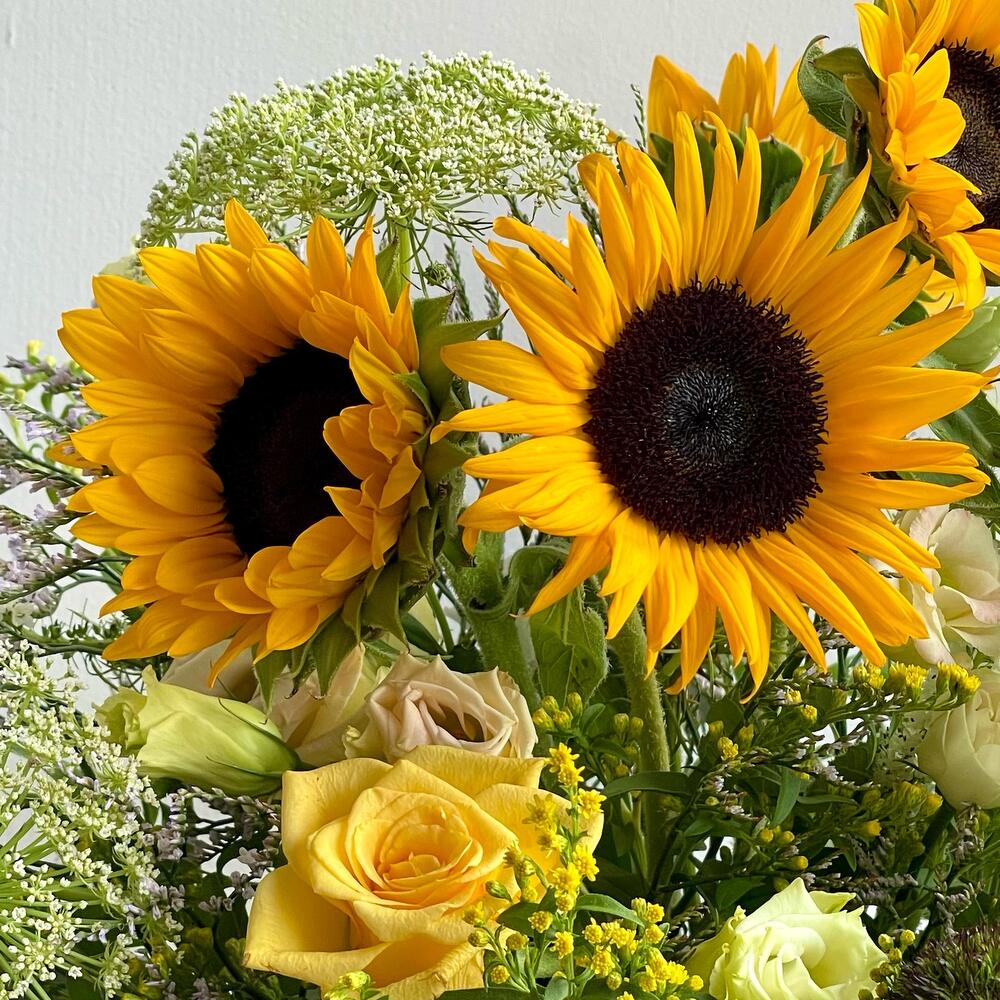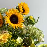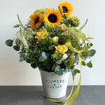 Veronica - 5 pcs Solidago - 4 pcs Sunflower - 7 pcs Eucalyptus - 1 pcs Lisianthus - 3 pcs rose - 4 pcs bucket - 1 pcs wild daucus carrot - 4 pcs