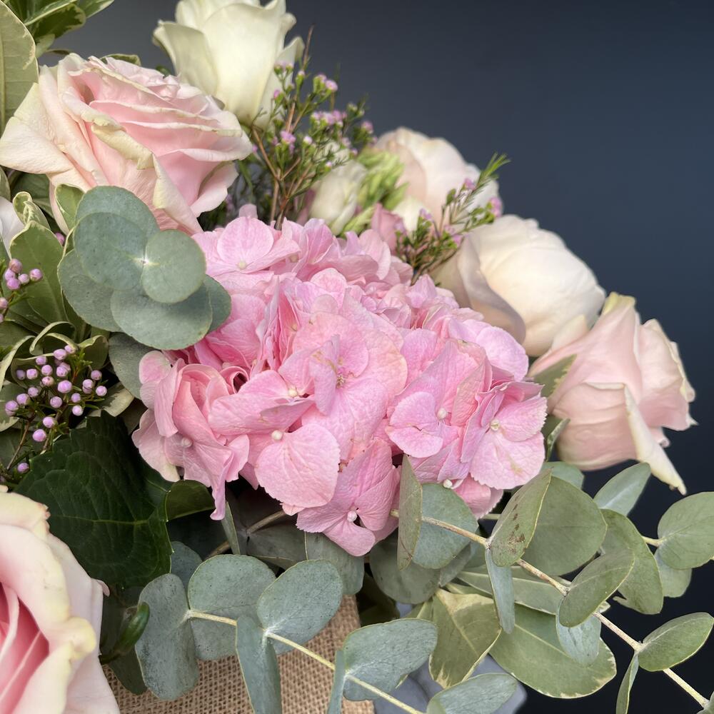 Ribbon - 1 pcs hydrangea - 2 pcs Foam - 3 pcs Lisianthus - 6 pcs Pistachio - 3 pcs rose - 15 pcs the kings - 5 pcs eucalyptus - 5 pcs bag - 1 pcs