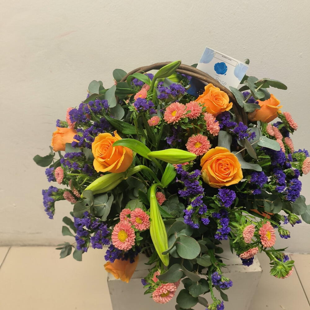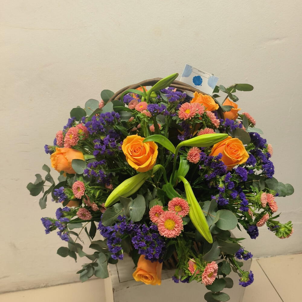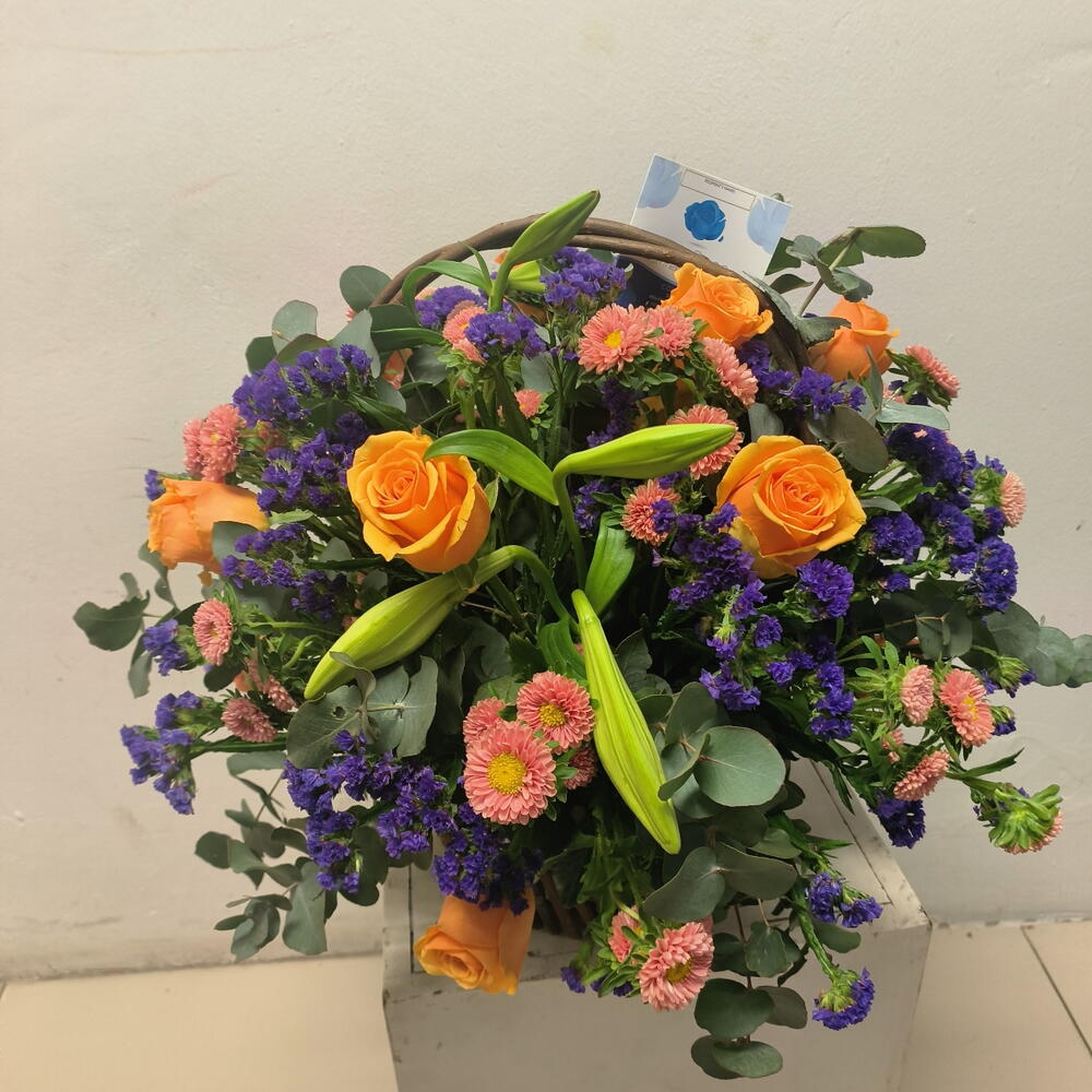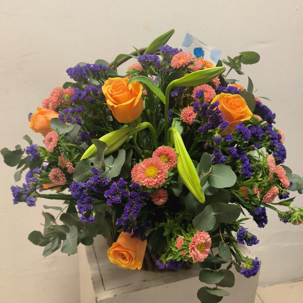 Orange roses, white lillies, purple statice and greenery arranged beautifully in a wooden basket