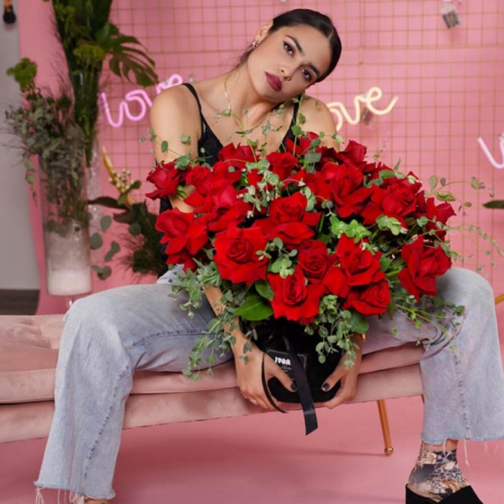 Roses 30 pcs Box 1 pcs Eucalyptus 8 pcs Ribbon 1 pcs