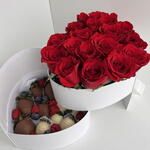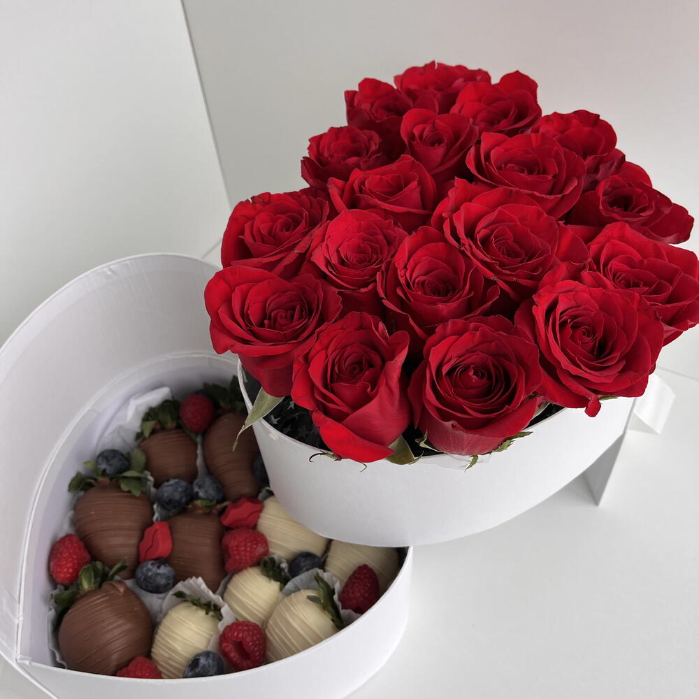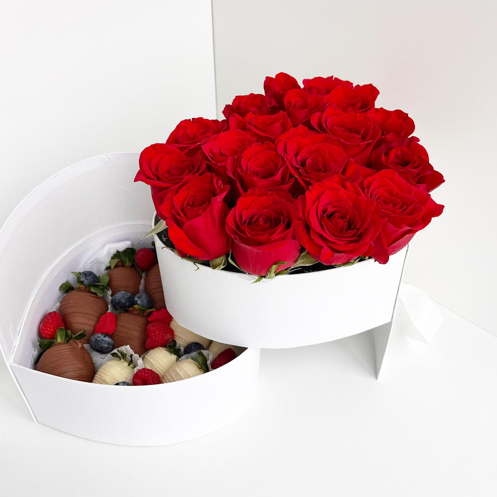 An elegant two-tier white box featuring stunning red roses on the top tier and decadent chocolate-covered strawberries on the bottom. The vibrant roses symbolize love and passion, while the hand-dipped strawberries offer a sweet and indulgent treat. This luxurious combination makes a perfect gift for romantic occasions, celebrations, or simply to delight someone special.
