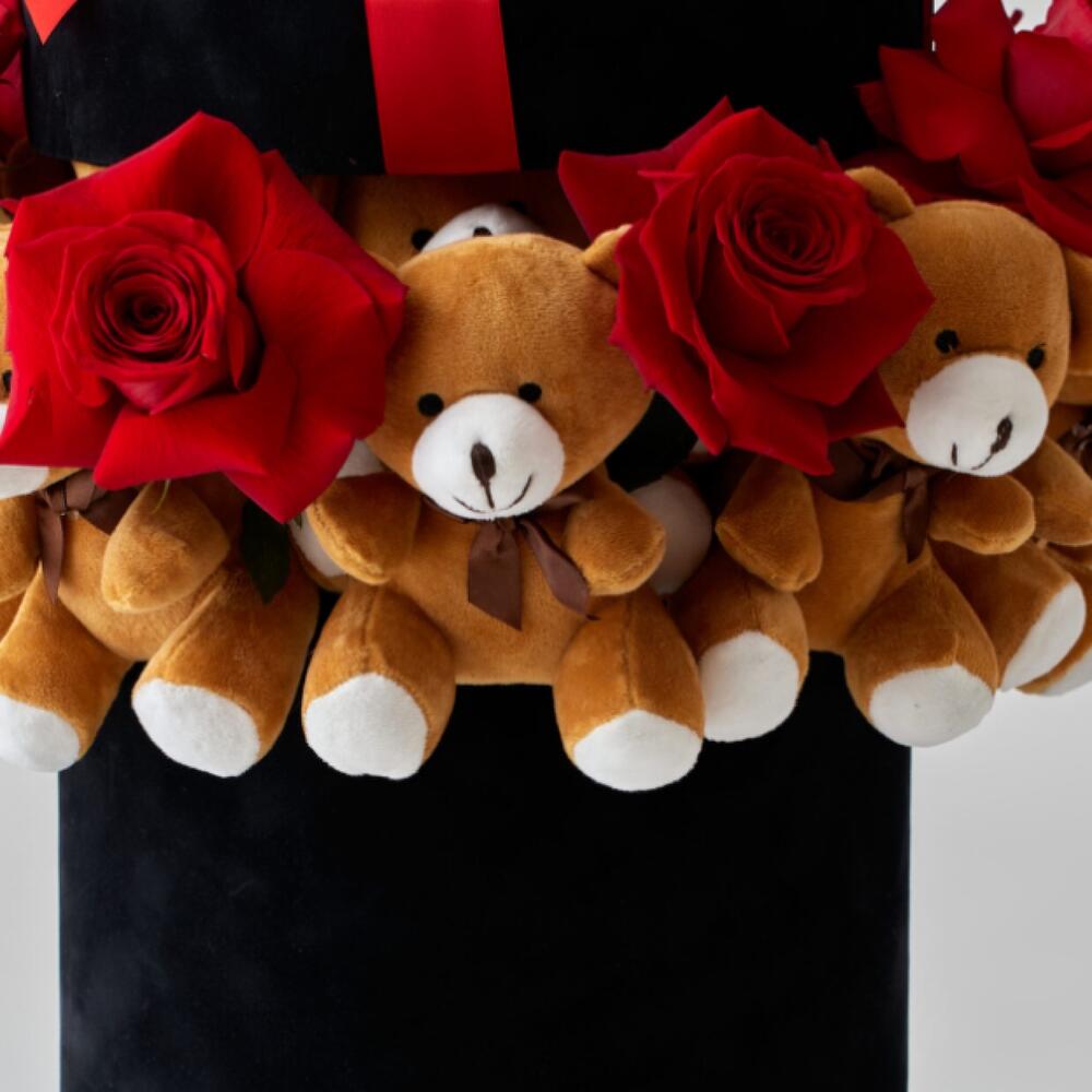 Ribbon - 1 pcs Box - 1 pcs Teddy bear - 17 pcs red roses preserved - 7 pcs