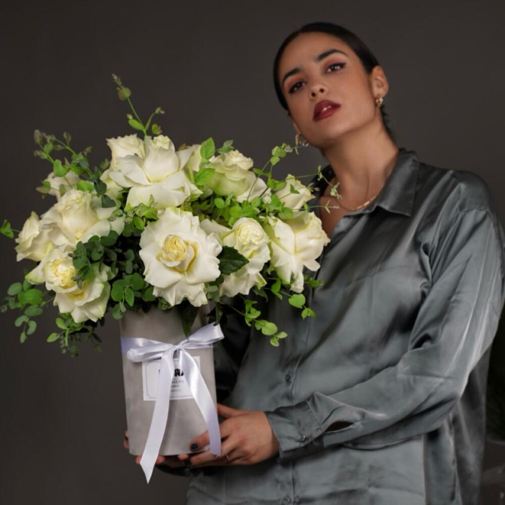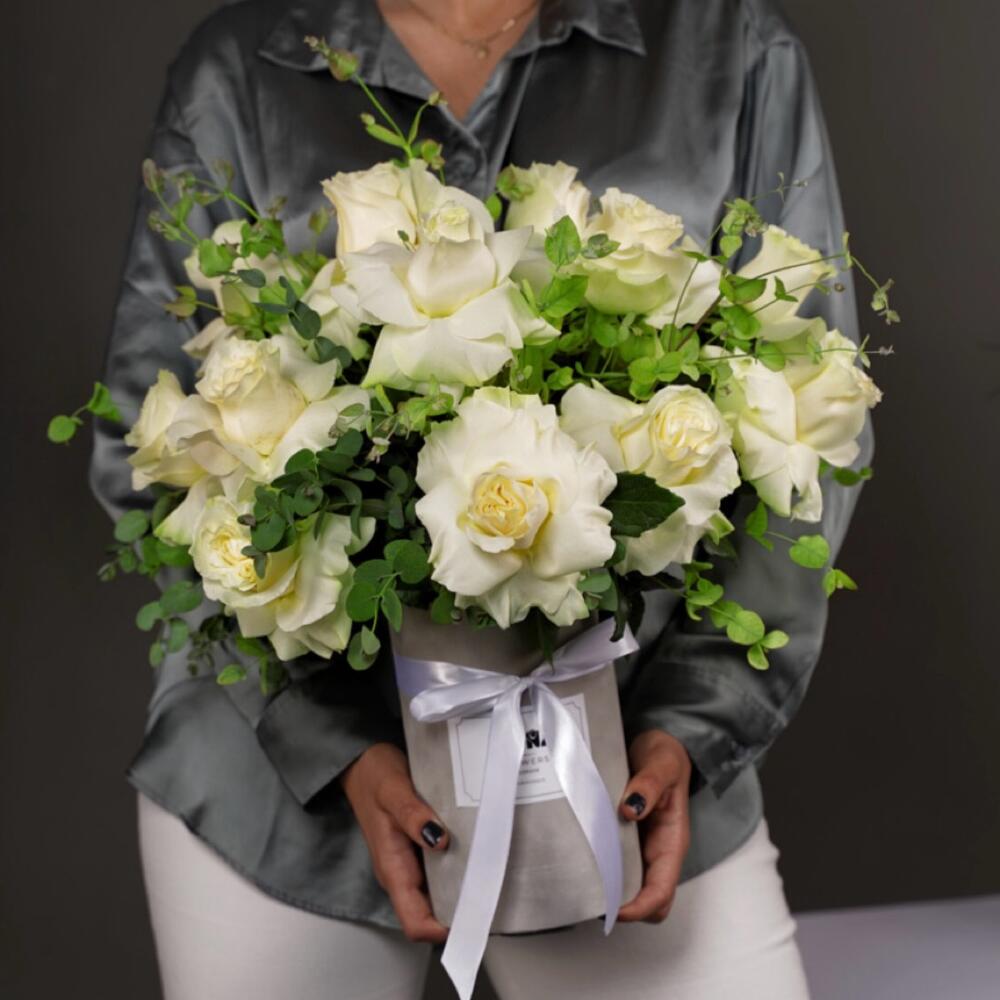 Ribbon - 1 pcs Eucalyptus - 5 pcs Box - 1 pcs roses - 13 pcs