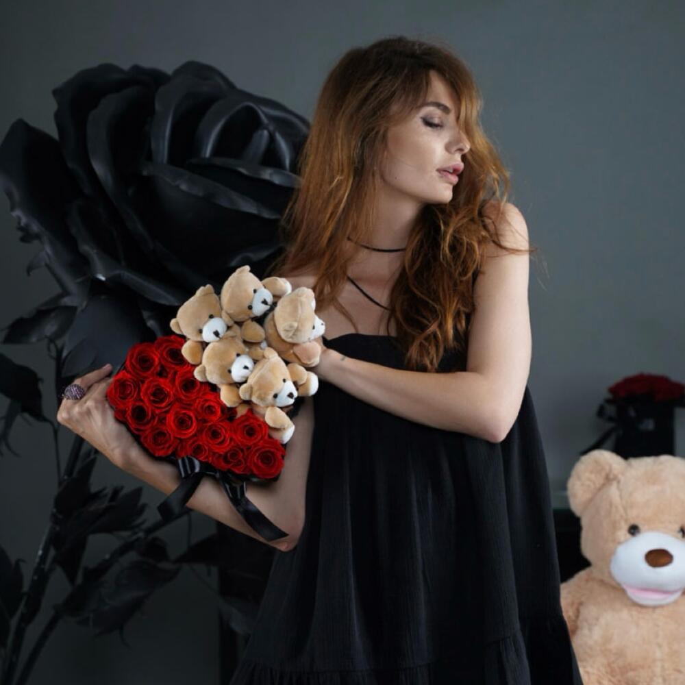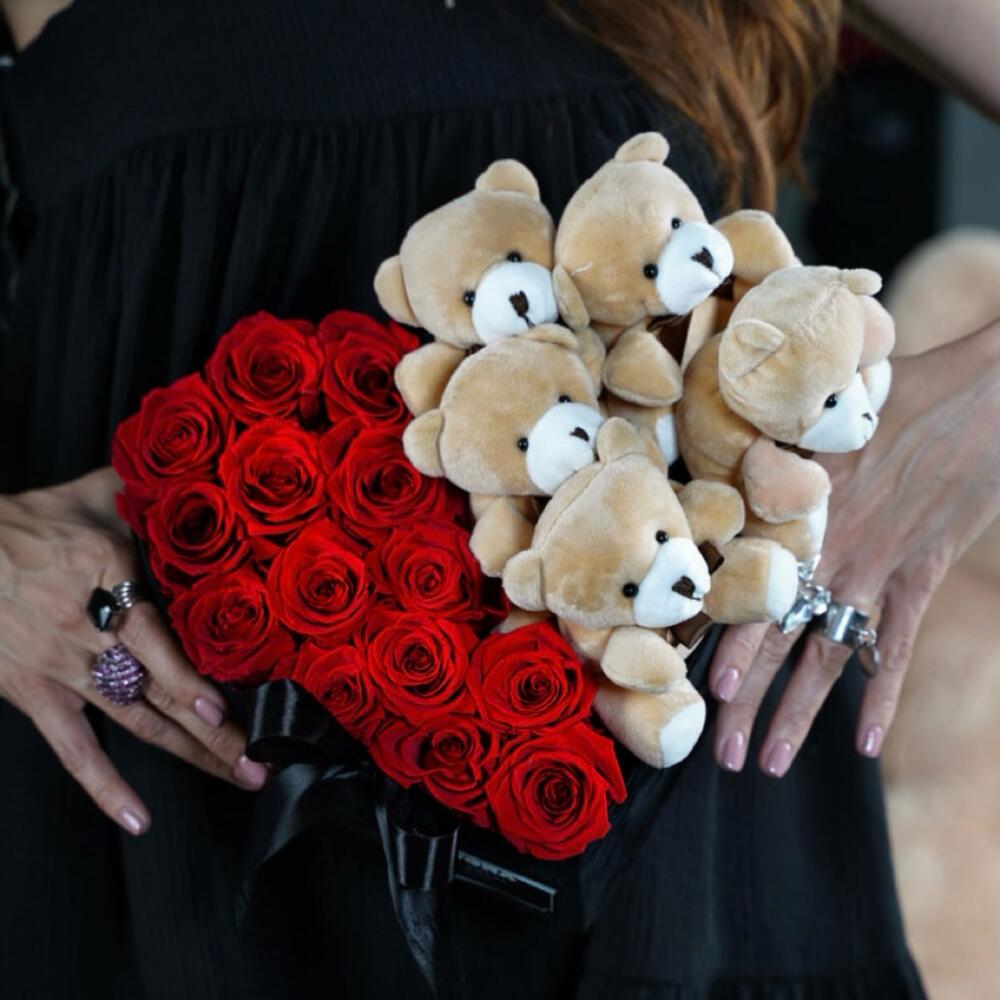 Ribbon - 1 pcs Box - 1 pcs roses preserved - 15 pcs taddy bear - 5 pcs