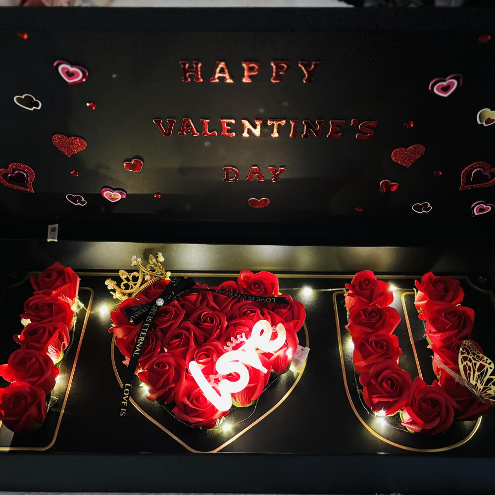 Red rose - 29 pcs butterfly - 1 pcs led light - 1 pcs crown - 1 pcs customized box - 1 pcs love light tag - 1 pcs