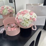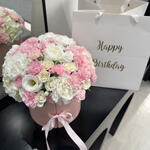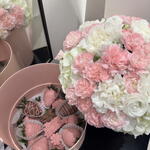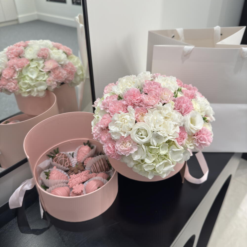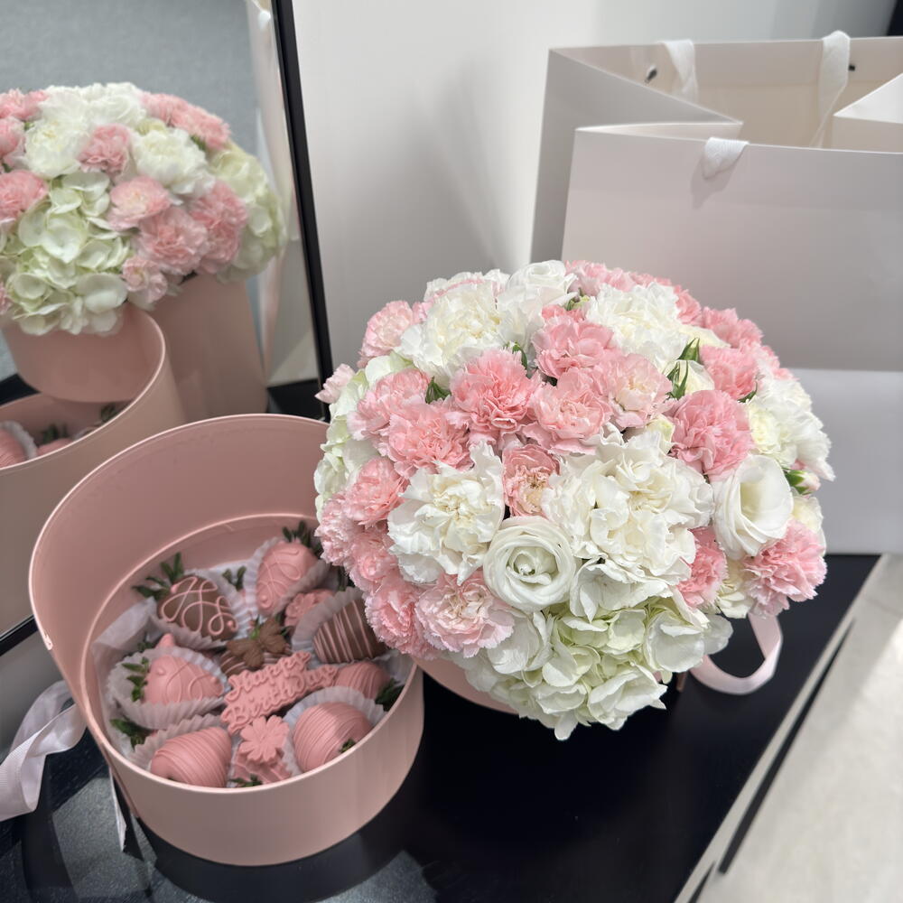 A stylish round gift box filled with a beautiful combination of fresh flowers and chocolate-covered strawberries. The delicate blooms bring elegance and charm, while the juicy strawberries, dipped in smooth chocolate, add a touch of sweetness. This luxurious arrangement is perfect for expressing love, appreciation, or celebrating a special occasion.