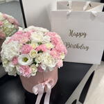 Flowers in a pink box with flowers