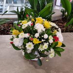 Basket - 1 pcs Ruskus - 2 pcs rose - 4 pcs mini carnations - 2 pcs sprays - 2 pcs asters - 2 pcs