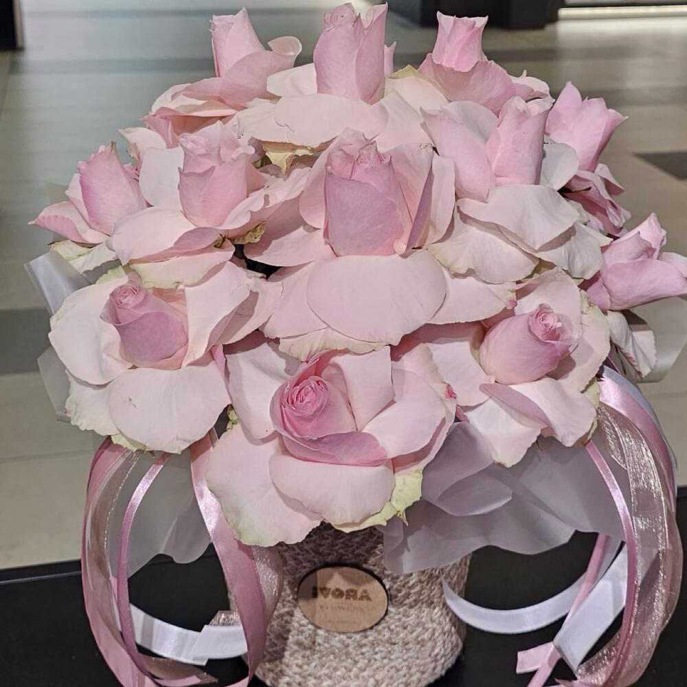 Ribbon - 4 pcs Basket - 1 pcs roses pink mondial - 15 pcs