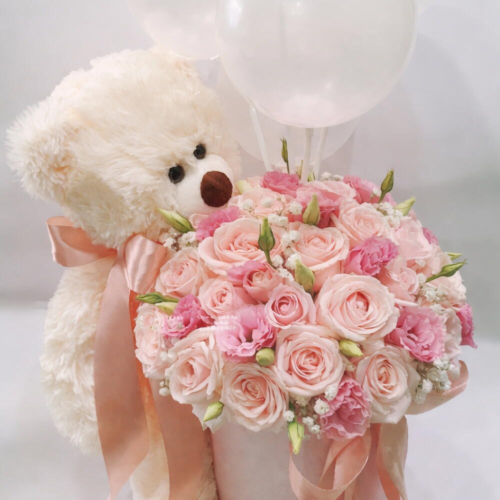 Lisianthus - 9 pcs baby breath - 7 pcs teddy - 1 pcs balloons - 3 pcs roses - 15 pcs babe roses - 11 pcs