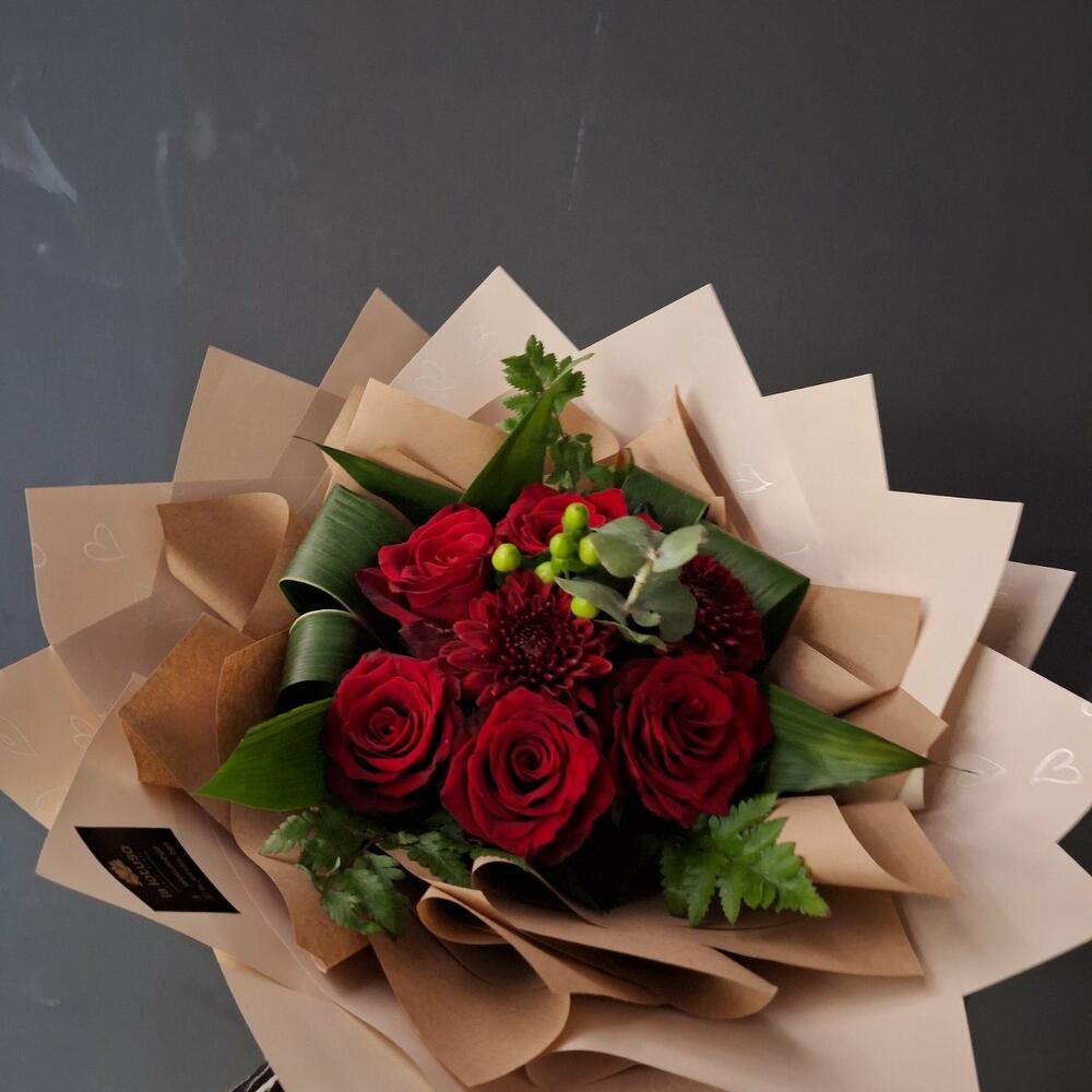 Satin ribbon - 1 pcs decorative paper - 8 pcs red roses - 7 pcs special flower - 1 pcs green mix - 4 pcs