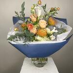 hydrangea white - 4 pcs greenery mix - 1 pcs kala lilies - 5 pcs roses - 3 pcs ranunculus butterfly - 5 pcs pin cushions - 3 pcs