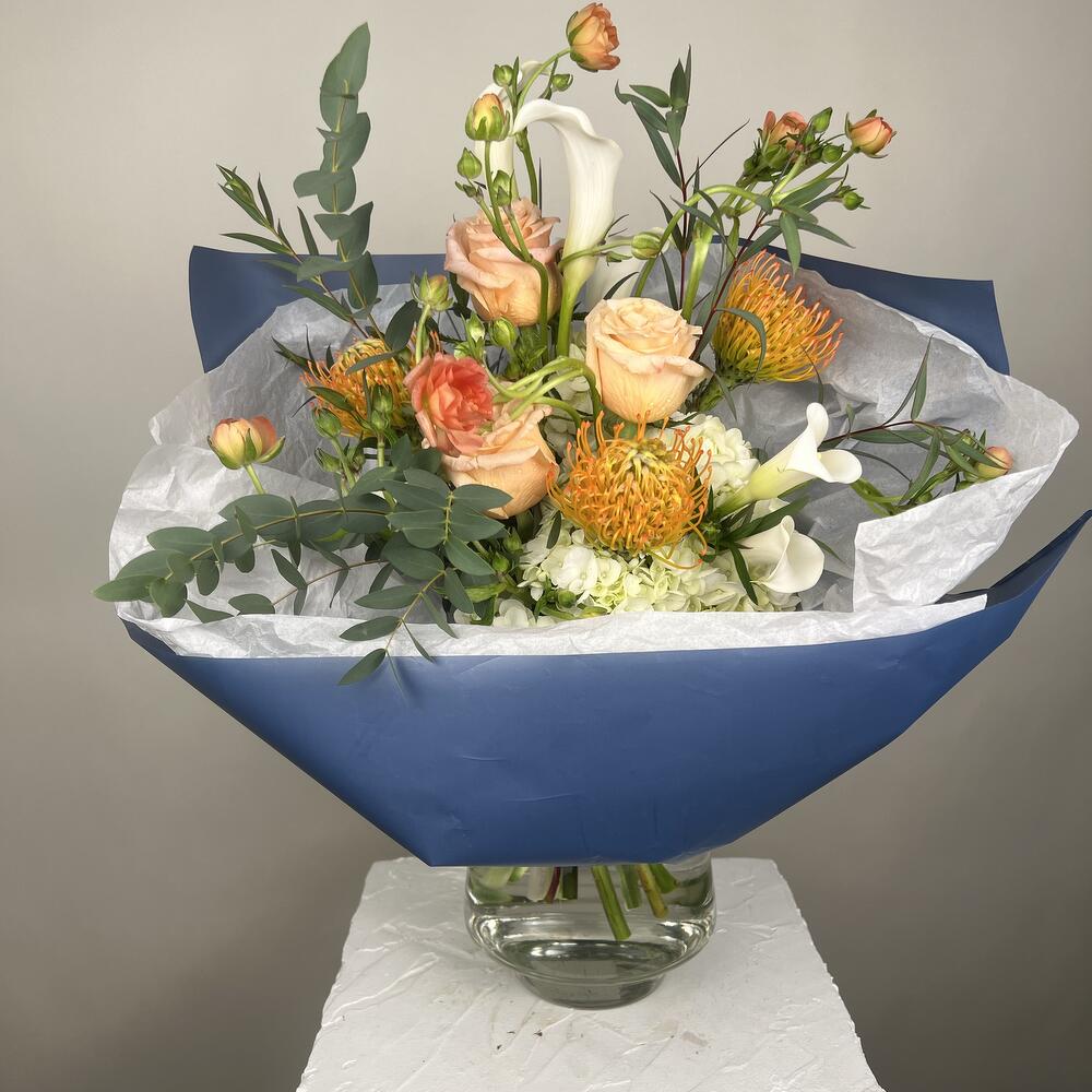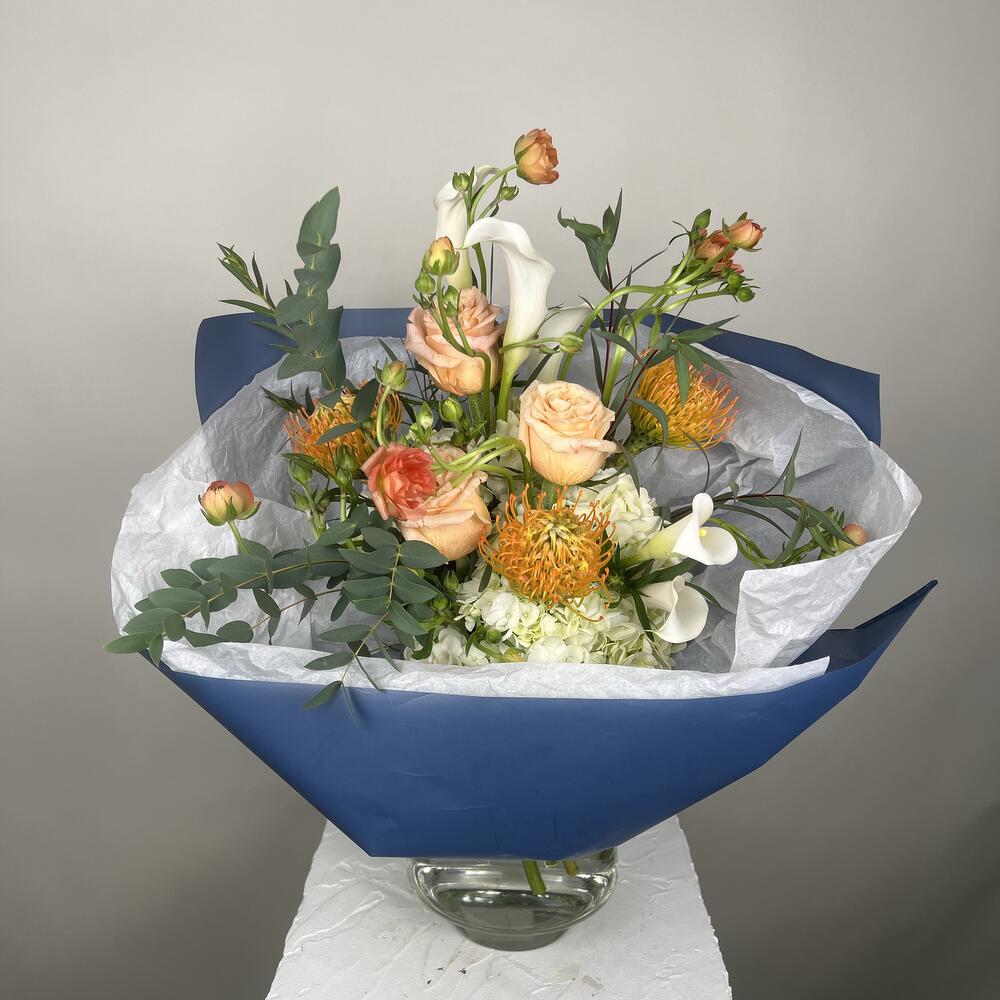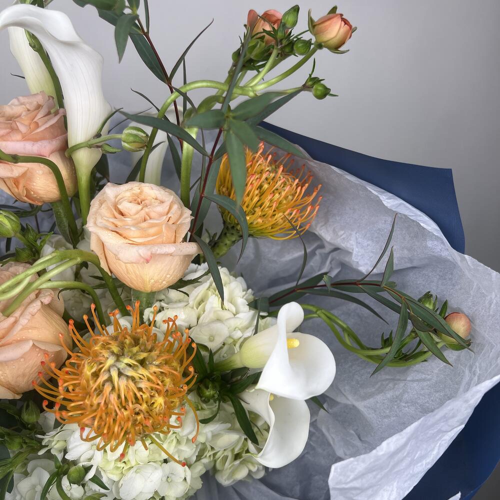 hydrangea white - 4 pcs greenery mix - 1 pcs kala lilies - 5 pcs roses - 3 pcs ranunculus butterfly - 5 pcs pin cushions - 3 pcs