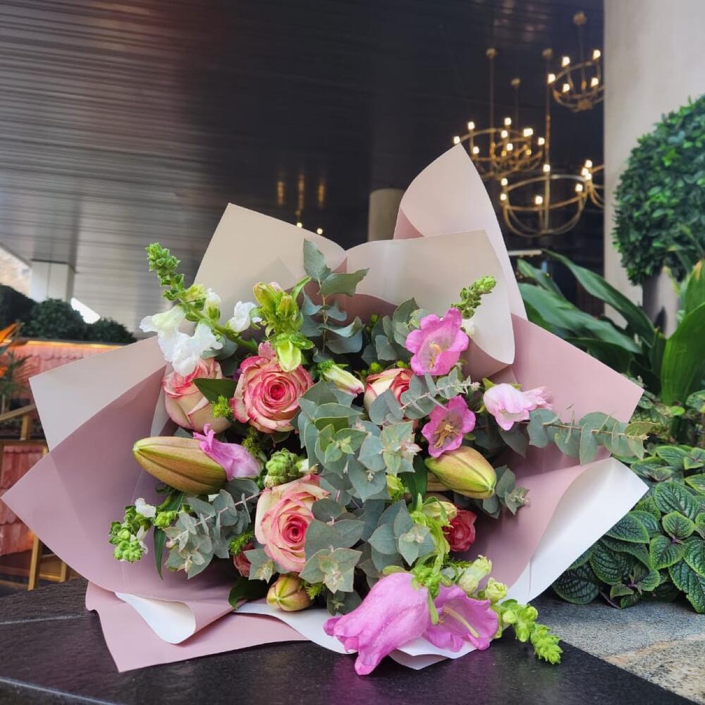 Snapdragon - 5 pcs Lilies - 5 pcs wrapping paper - 2 pcs pink roses - 5 pcs gum - 5 pcs