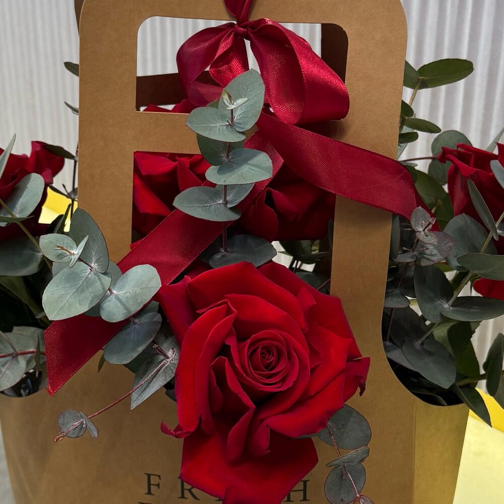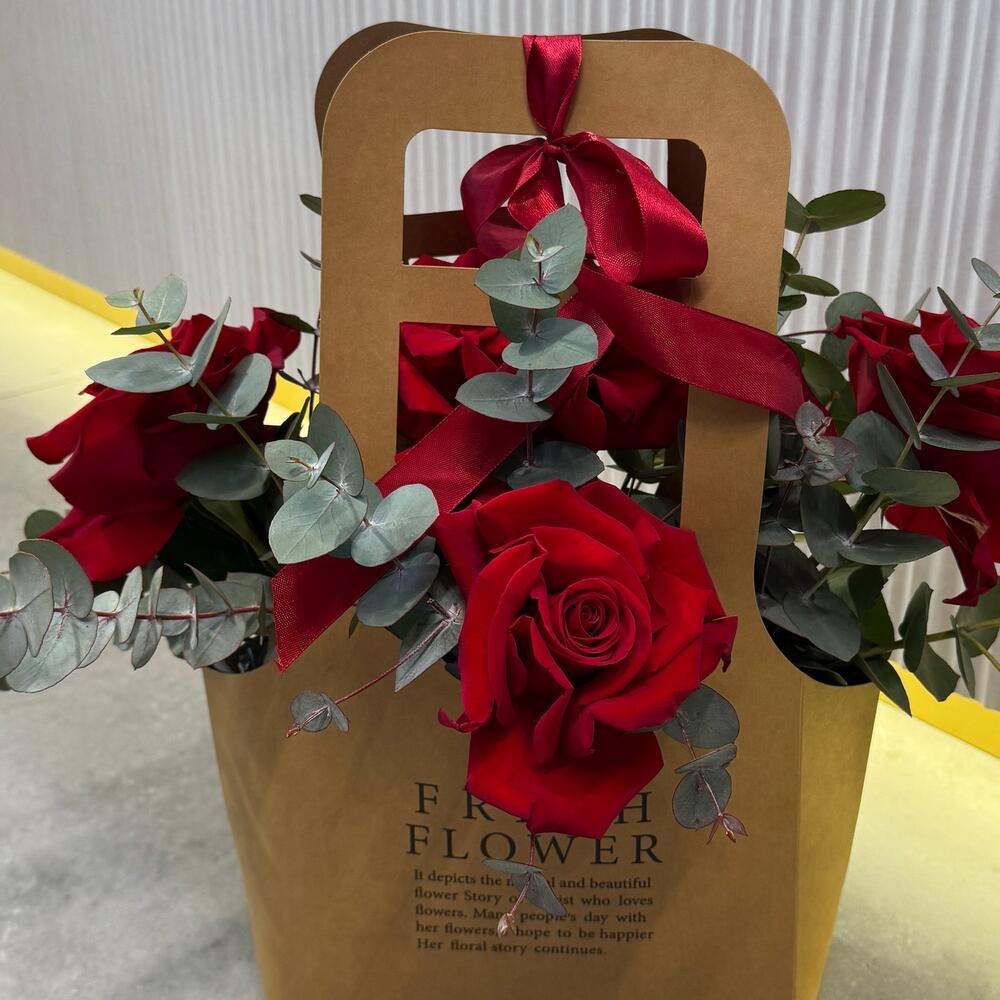 Ribbon - 1 pcs Eucalyptus - 5 pcs paper bag - 1 pcs roses - 5 pcs