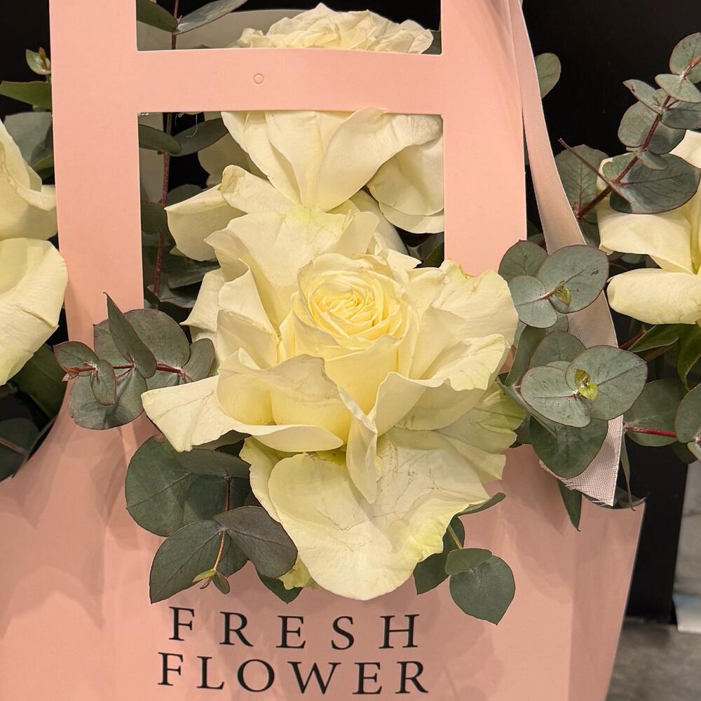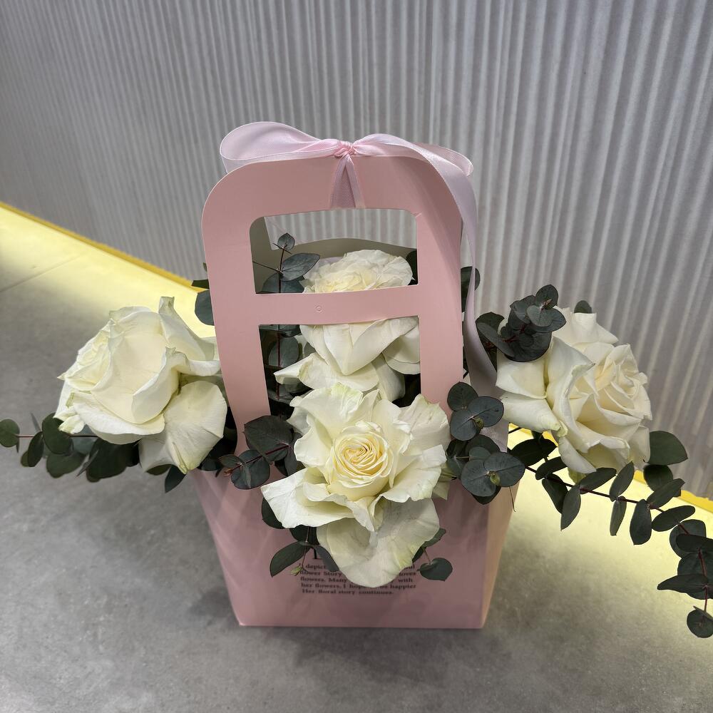 Ribbon - 1 pcs Eucalyptus - 5 pcs bag - 1 pcs roses - 5 pcs