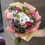 Limonium - 1 pcs Chrysanthemum - 2 pcs Alstroemeria - 2 pcs Gypsophila - 2 pcs Pistachio - 1 pcs rose - 5 pcs carnation - 3 pcs wrapping paper - 3 pcs