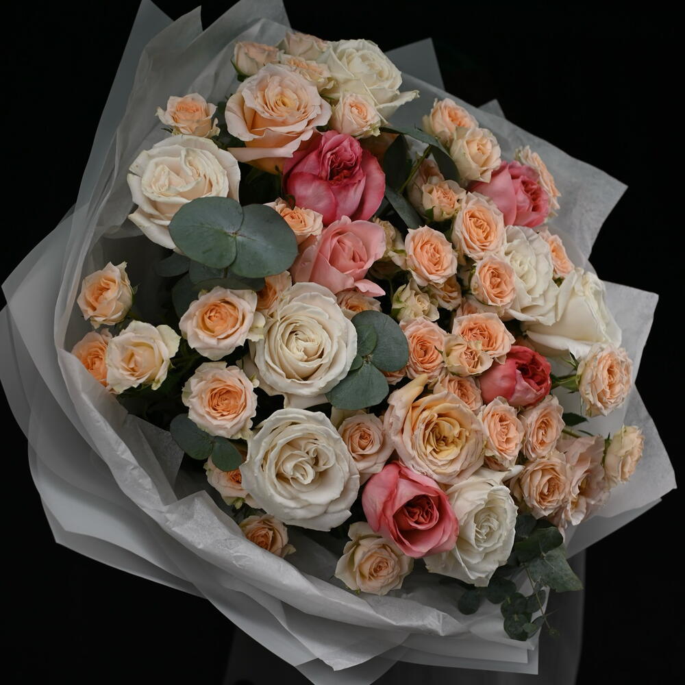 Eucalyptus - 7 pcs Spray rose - 8 pcs garden roses - 13 pcs corean foil - 6 pcs