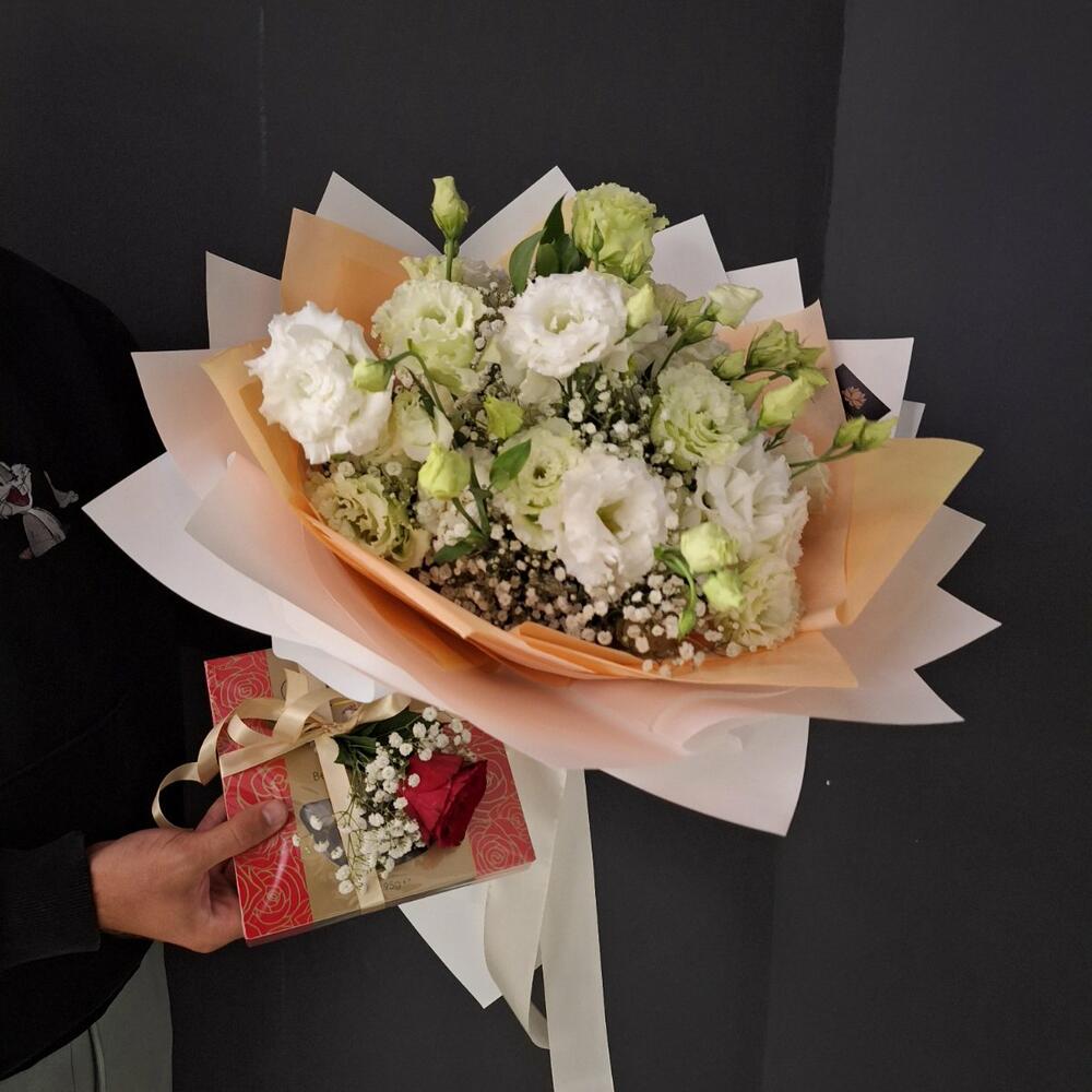 Red rose - 1 pcs Satin ribbon - 1 pcs Gypsophila - 4 pcs Lisianthus - 13 pcs chocolates - 1 pcs wrapping paper - 5 pcs