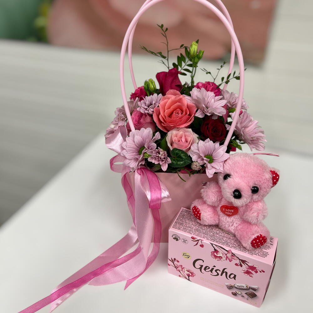 Chrysanthemum - 1 pcs Pistacia - 1 pcs ribbon satin - 2 pcs flower bag - 1 pcs eusthoma - 1 pcs roses red - 4 pcs roses pink - 3 pcs sweets geisha 150 gr - 1 pcs bear toy 7 cm - 1 pcs