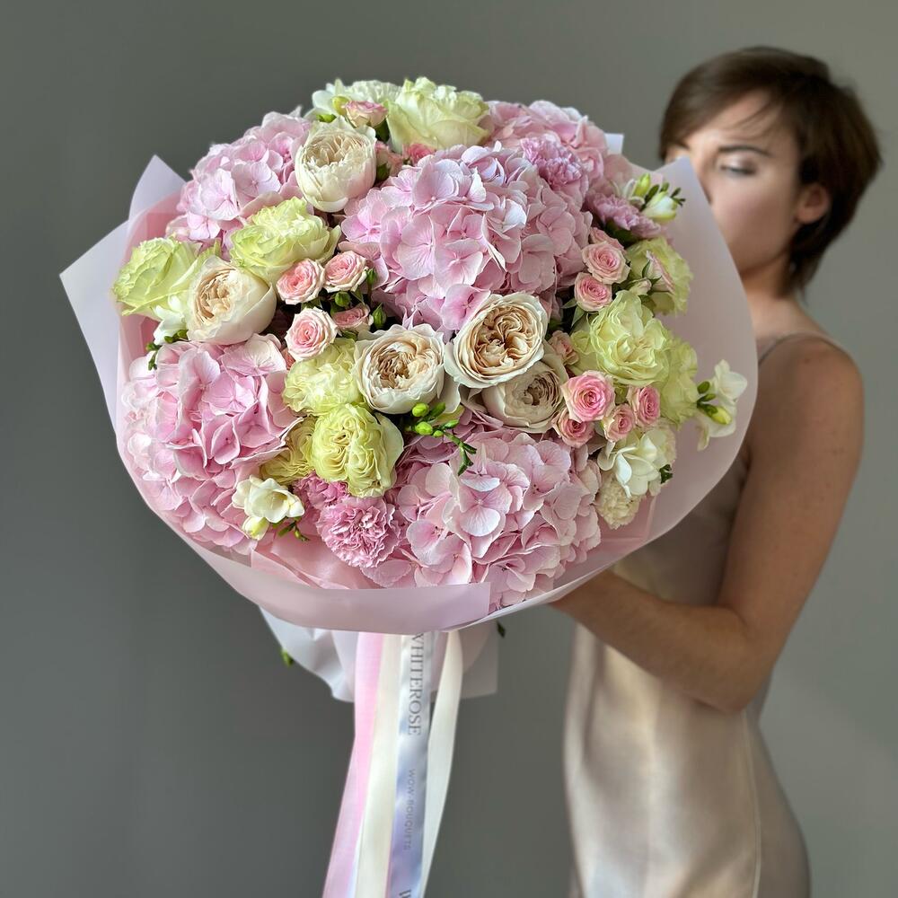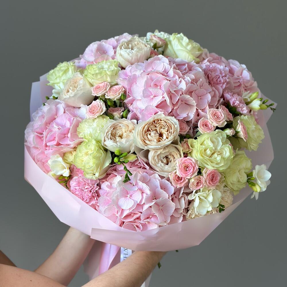 Spray rose - 5 pcs Hydrangea - 5 pcs Freesia - 5 pcs rose - 10 pcs dianthus - 7 pcs