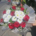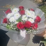 Greenery - 5 pcs Gypsophila - 2 pcs Wrapping - 1 pcs Chrysanthemum white - 2 pcs red roses - 9 pcs