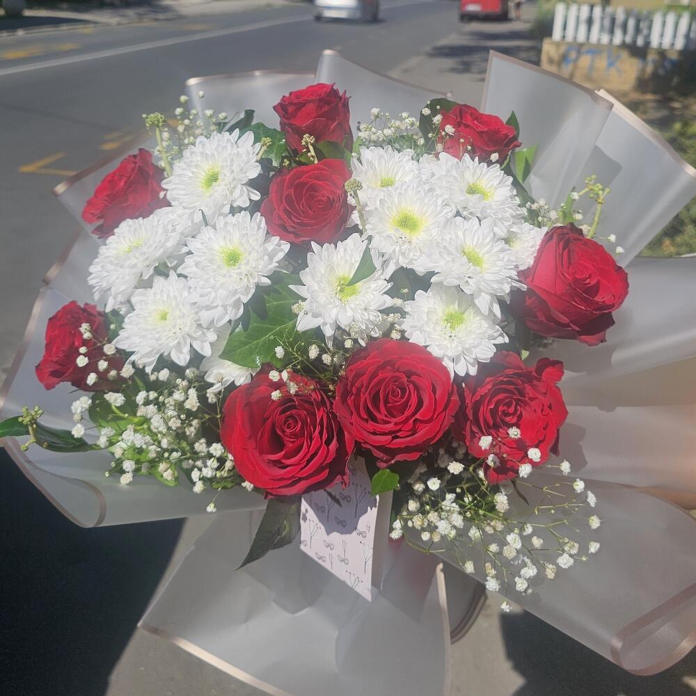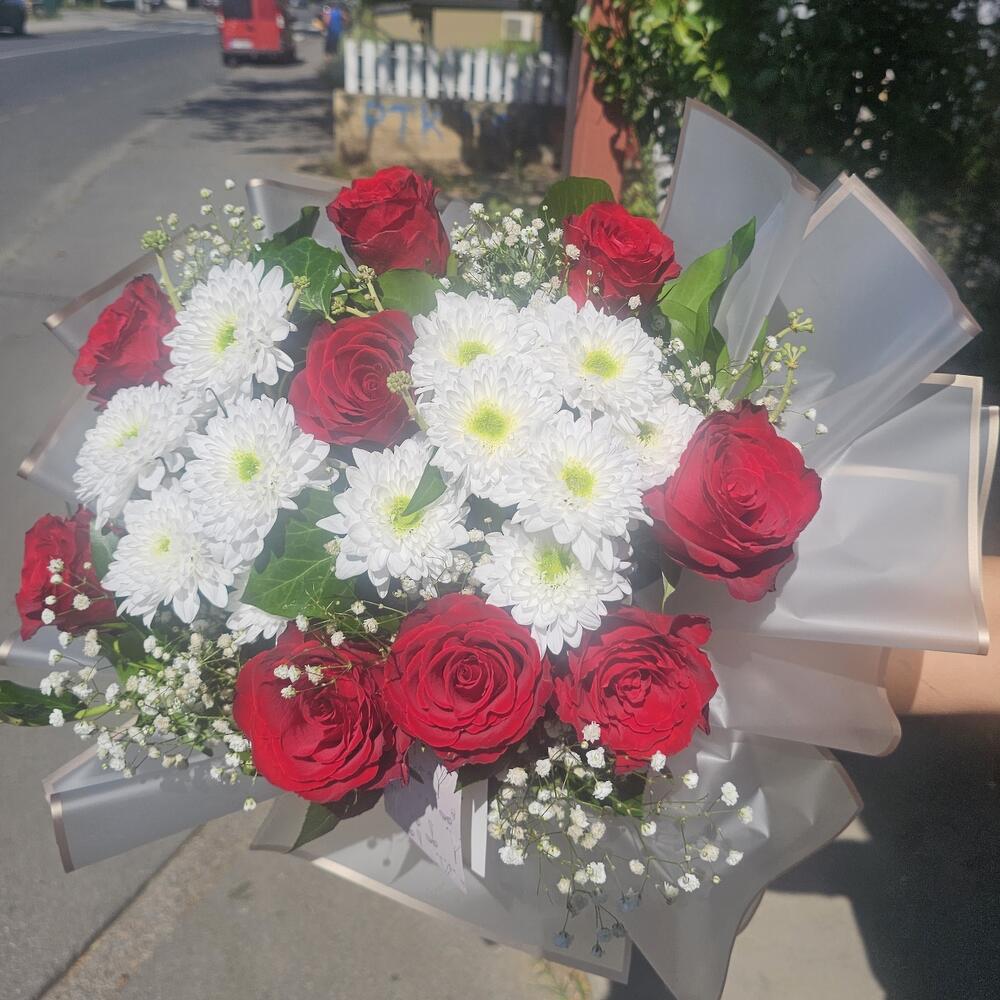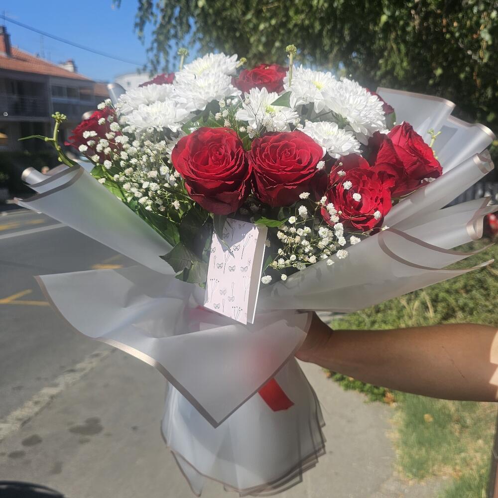 Greenery - 5 pcs Gypsophila - 2 pcs Wrapping - 1 pcs Chrysanthemum white - 2 pcs red roses - 9 pcs