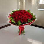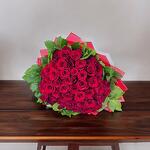 Introducing the Grandeur Bouquet – 50 Red Roses, a magnificent display of passion and love featuring 50 exquisite long-stem red roses.