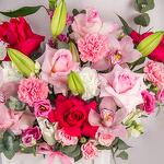 A luxurious floral box arrangement featuring a stunning mix of pink orchids, fragrant roses, and fresh eucalyptus.