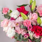 Lilies - 3 pcs carnation - 8 pcs orchid cymbidium - 3 pcs eucalyptus leaves - 10 pcs roses - 8 pcs spray roses - 3 pcs