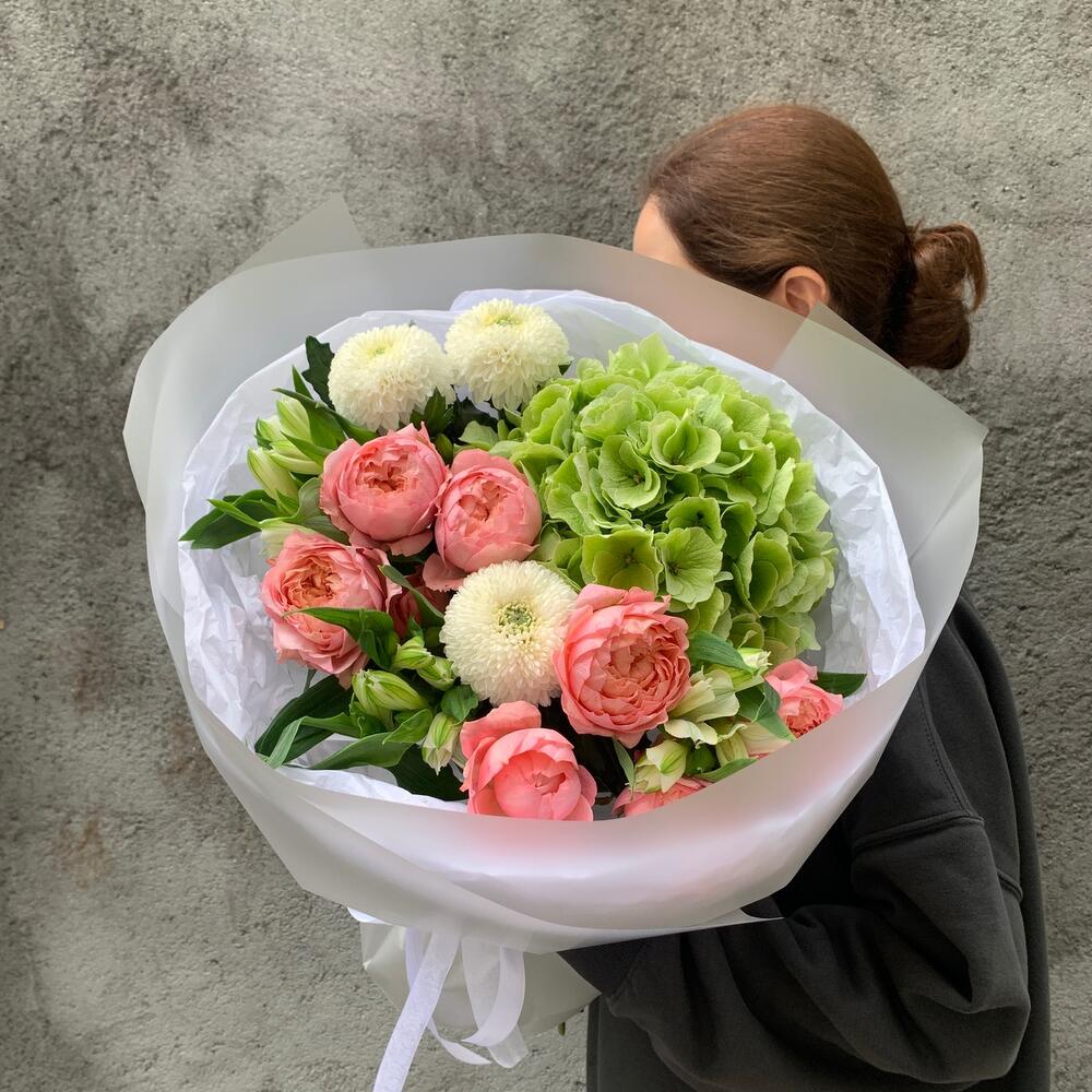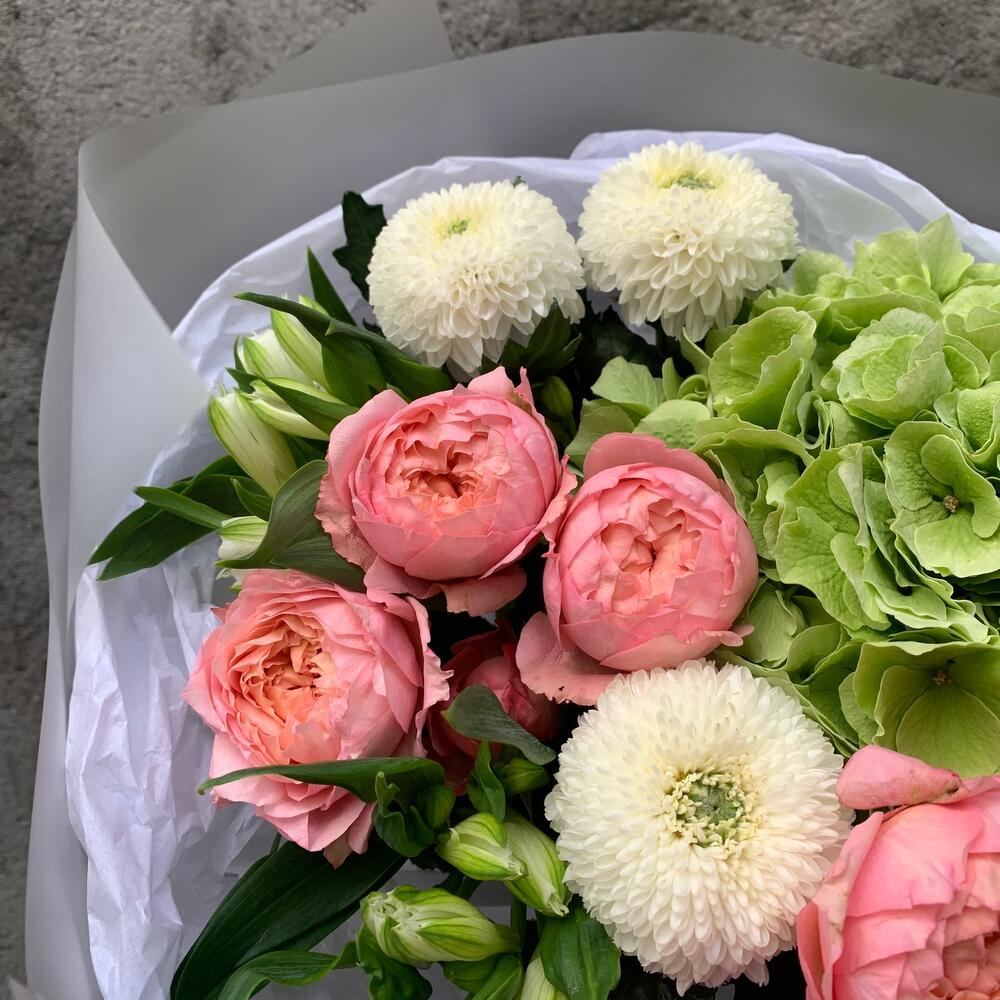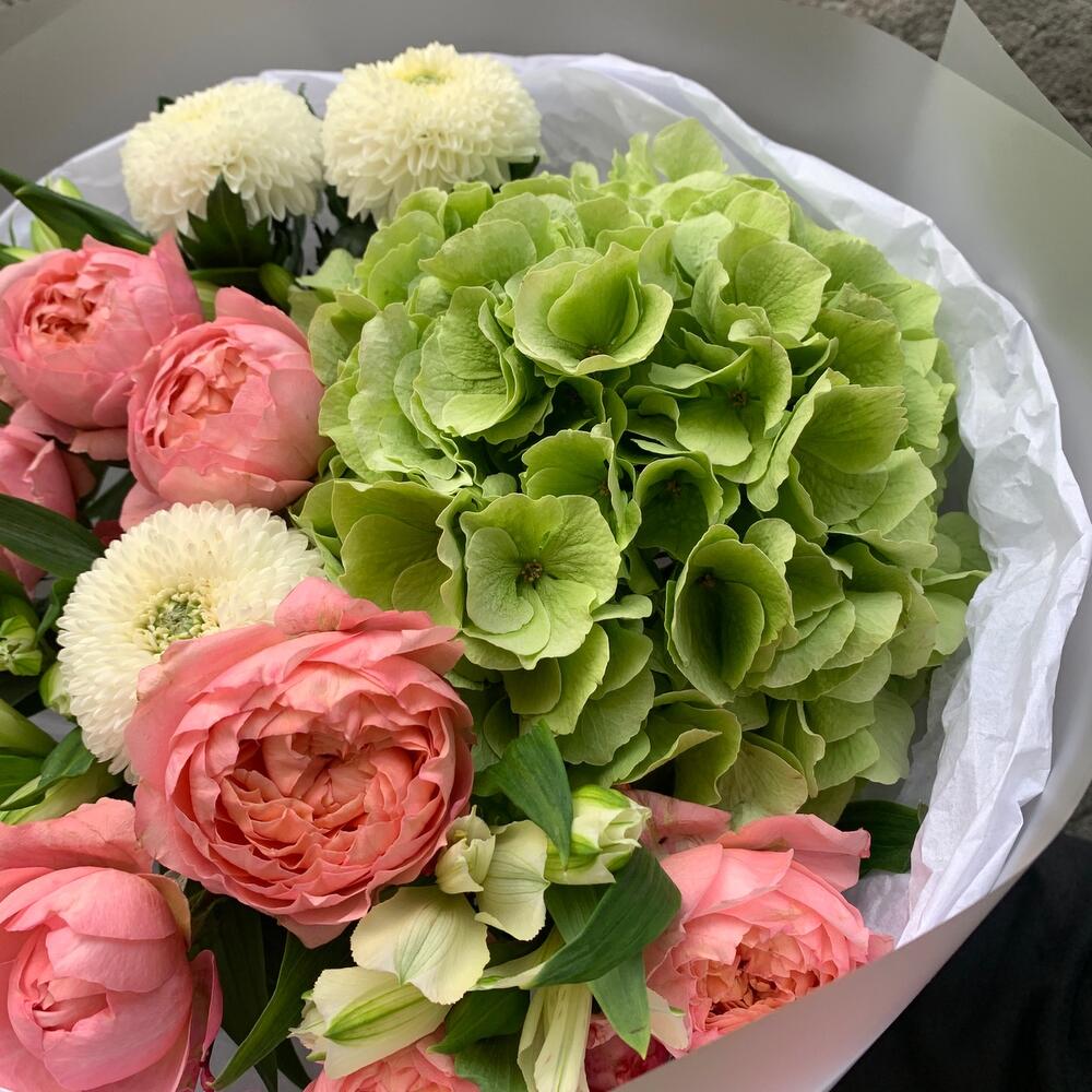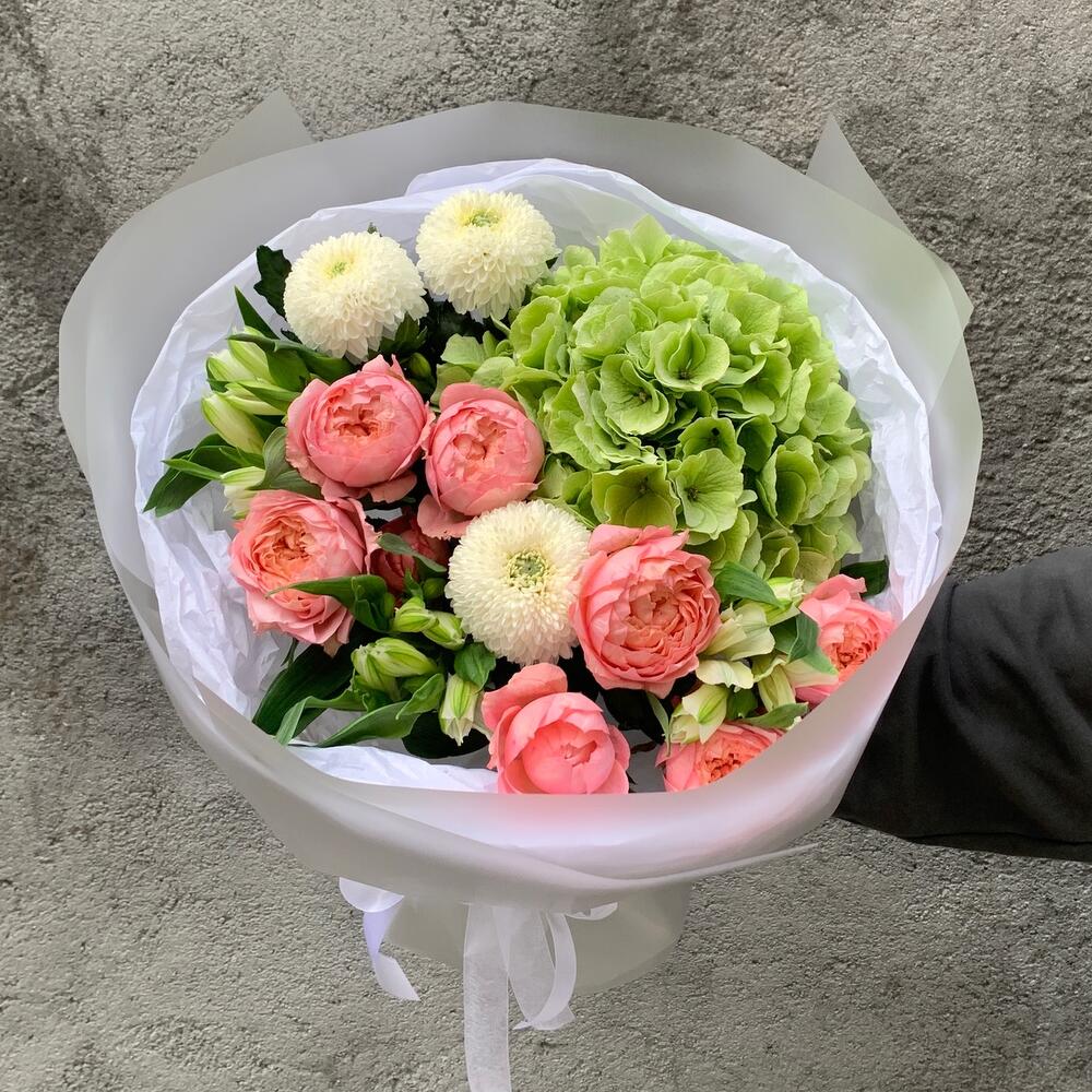 Chrysanthemum - 3 pcs Alstroemeria - 3 pcs hydrangea - 1 pcs packaging - 1 pcs juliet rose - 2 pcs