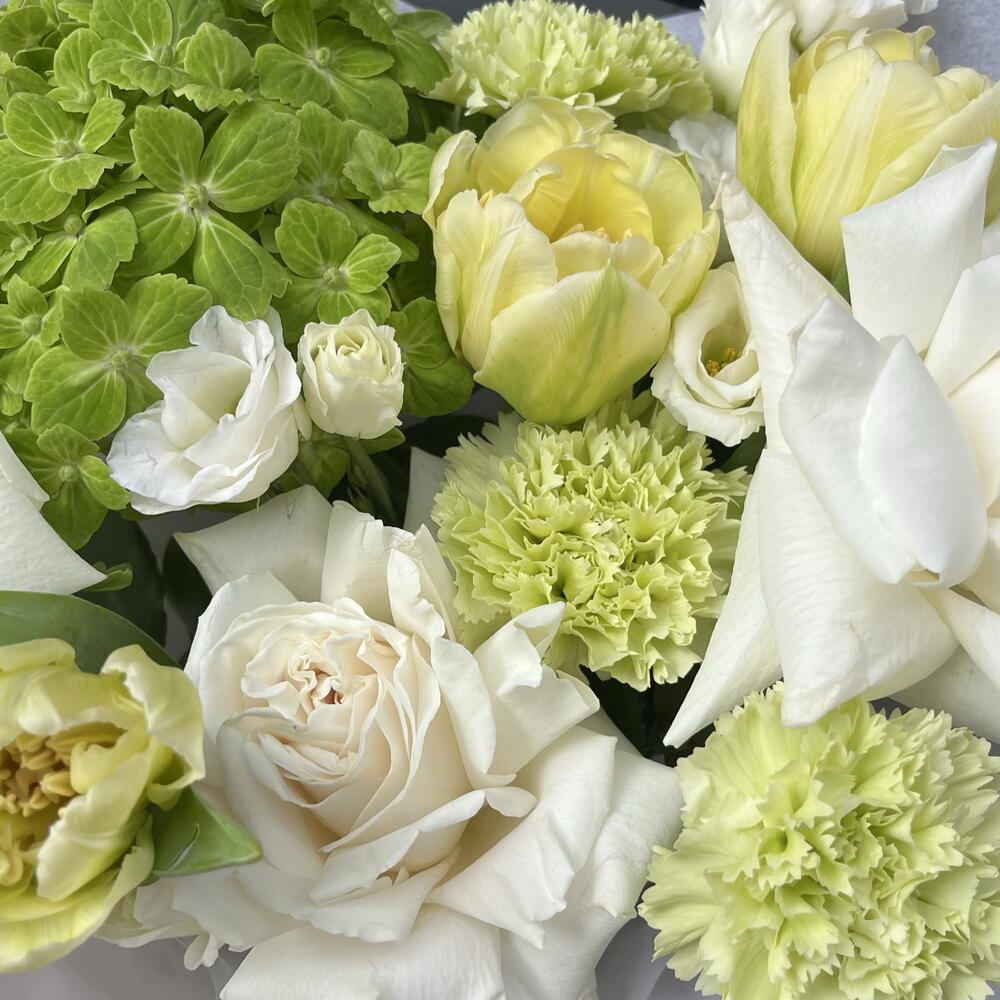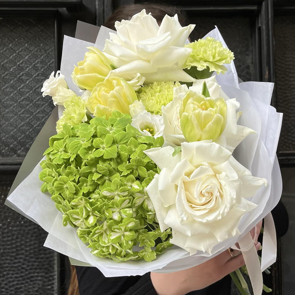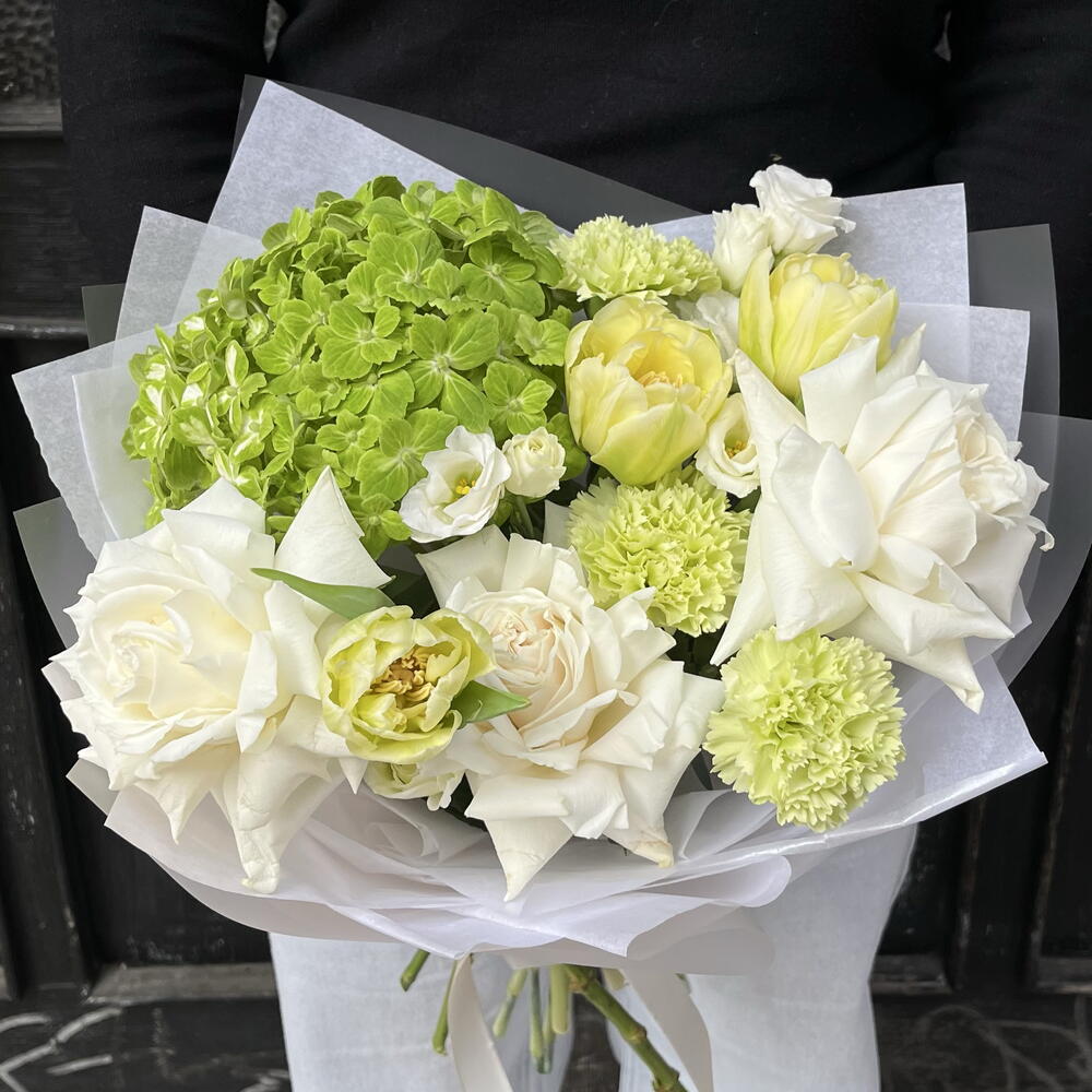 Eustoma - 2 pcs Tulips - 3 pcs rose - 3 pcs dianthus - 3 pcs hydrangea - 1 pcs