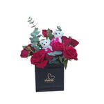 Red roses and baby rose red arranged in a black acrylic box.