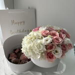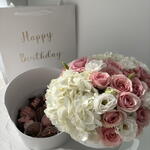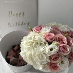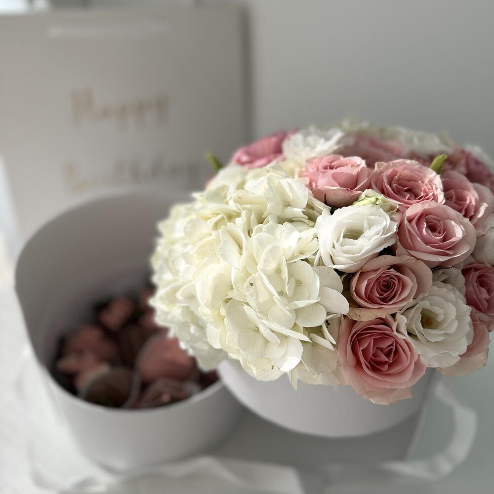 An elegant two-tier box featuring a delicate floral arrangement on the top tier and delicious chocolate-covered strawberries on the bottom. The floral tier includes three lush hydrangeas and five stems of charming spray roses, creating a soft and romantic touch. The bottom tier holds 12 handcrafted strawberries dipped in smooth, premium chocolate. A perfect combination of beauty and indulgence, making it an ideal gift for any special occasion.
