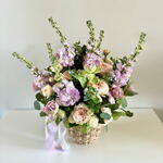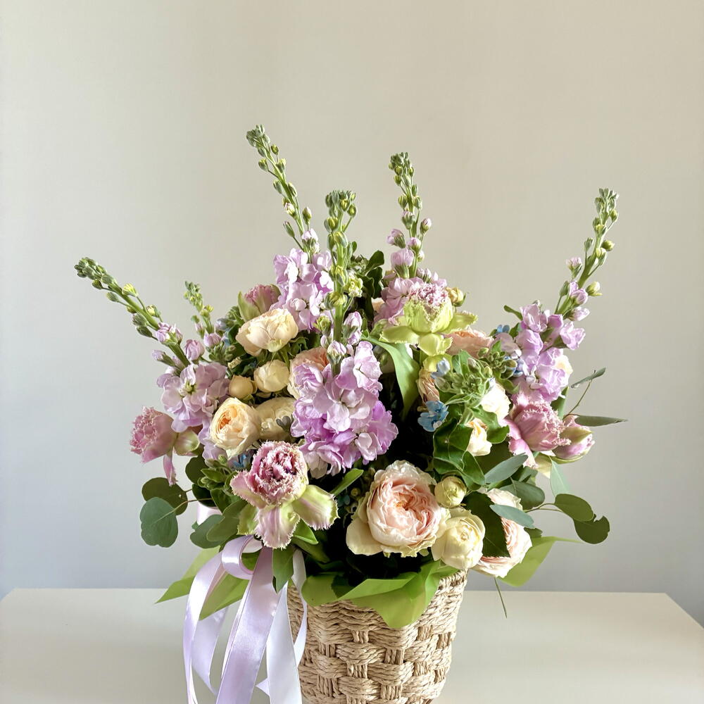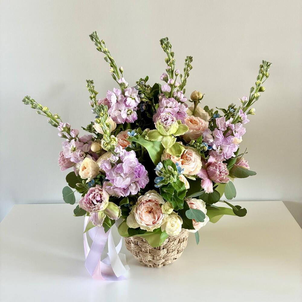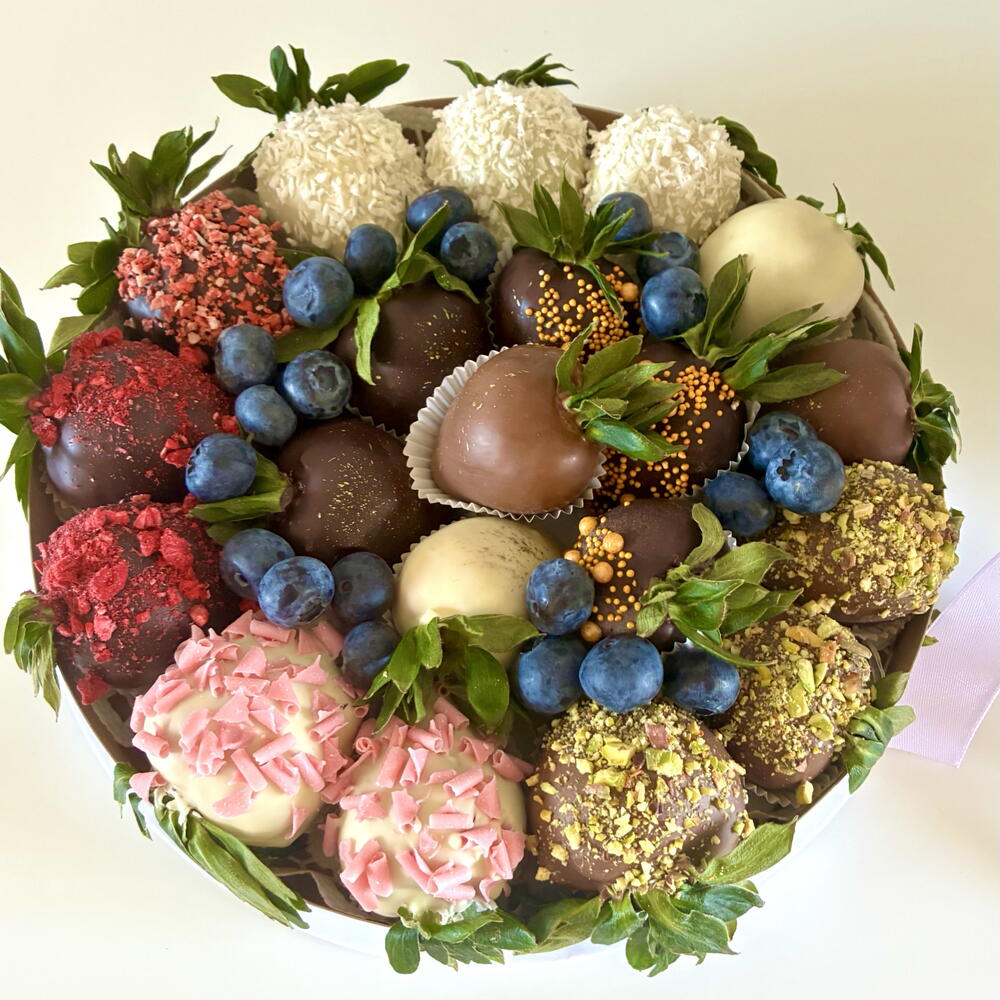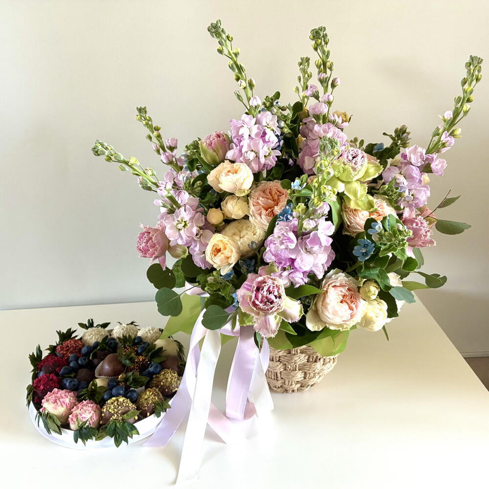 Eucalyptus - 4 pcs mattiola - 7 pcs strawberries in belgian chocolate - 20 pcs tweedia - 10 pcs peony-shaped tulips - 9 pcs peony-shaped roses - 10 pcs ornamental flowerpot - 1 pcs blueberry. - 100 g bushy peony-shaped roses. - 10 pcs a shipping bag. - 1 pcs