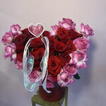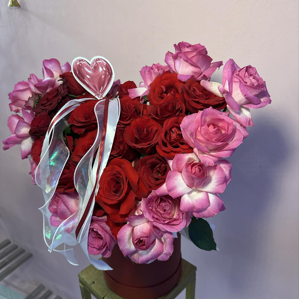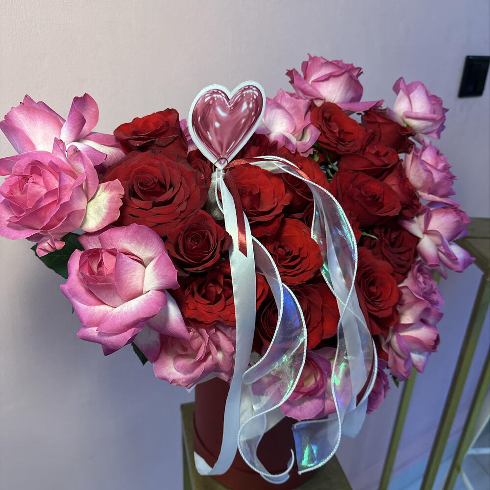 Red rose - 19 pcs Pink rose - 13 pcs ribbons - 3 pcs box red - 1 pcs heart card - 1 pcs