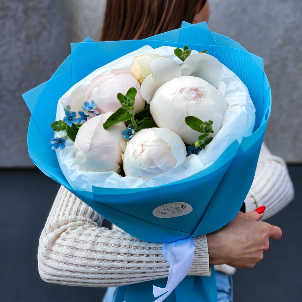 A delicate bouquet of lush white peonies accented with soft blue blooms and fresh greenery, elegantly wrapped in vibrant blue paper. Light, airy, and refined — perfect for expressing tenderness, purity, and quiet sophistication 🤍💙 The color of the flowers may vary depending on the season 👆