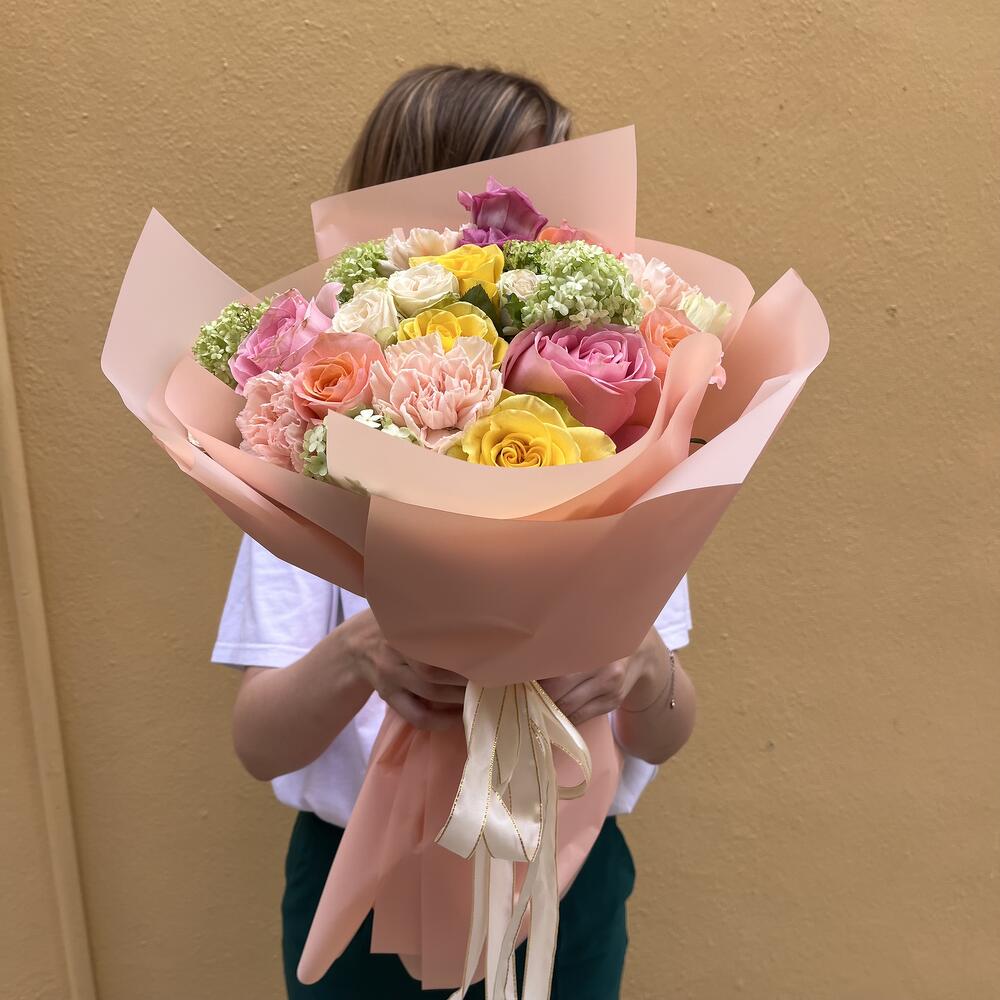 A colorful and lively hand-tied bouquet is an excellent choice for any occasion, whether its a just because gift, a thank you gesture, or to celebrate Womens Day. The bright pink, yellow, and white roses, mini hydrangeas, peach carnations, spray roses, and lisianthus are expertly arranged to create a cheerful and stunning composition thats sure to bring a smile to anyones face.