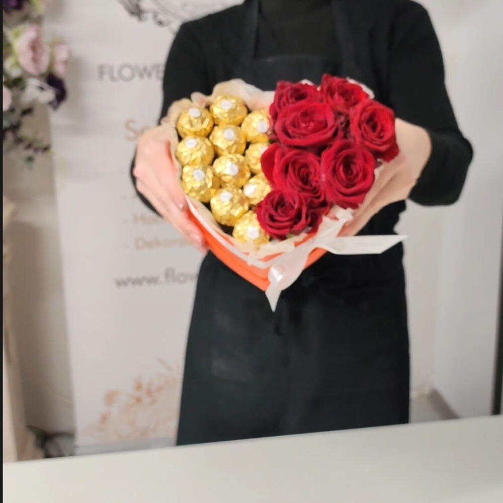 Diese elegante Herzbox vereint rote Rosen mit Ferrero-Rocher-Pralinen zu einem zeitlosen Geschenk voller Gefühl. Perfekt, um Liebe, Dankbarkeit oder besondere Momente stilvoll auszudrücken. ✨ Details Herzförmige Geschenkbox in Rot Frische rote Rosen, harmonisch arrangiert Original Ferrero Rocher Pralinen Hochwertige Verarbeitung elegante Schleife Fix fertig zum Verschenken 🎁 Ideal für Valentinstag Geburtstag Jahrestag Überraschung für einen besonderen Menschen 💬 Hinweis Jede Box wird mit viel Liebe handgefertigt. Leichte Abweichungen in Anordnung sind möglich – jede Box ist ein Unikat.