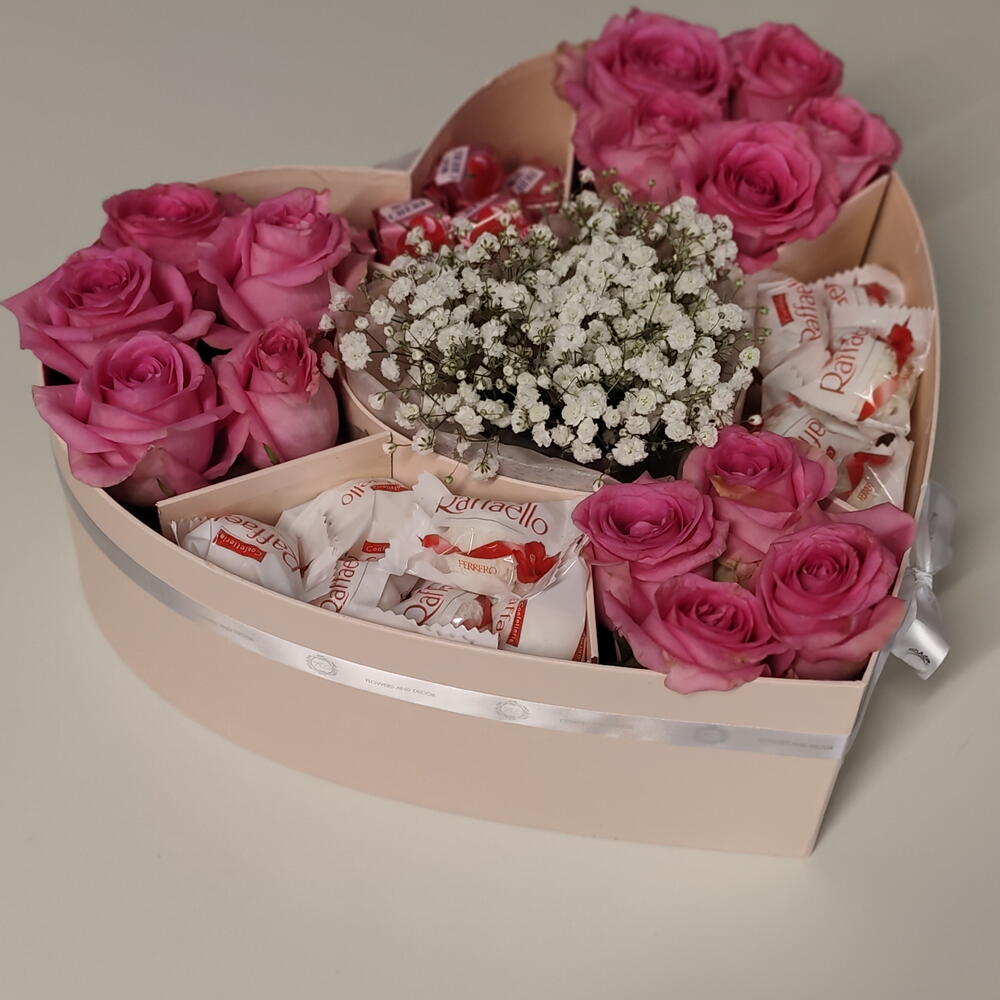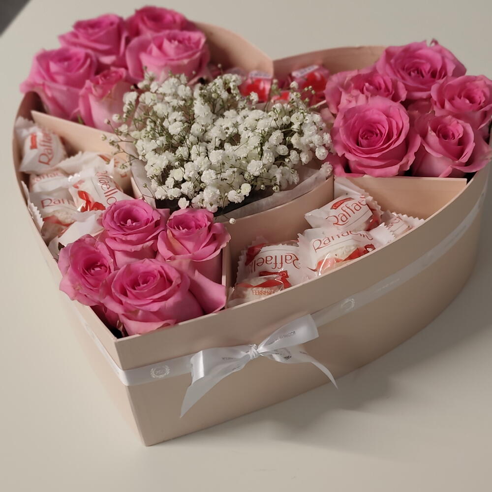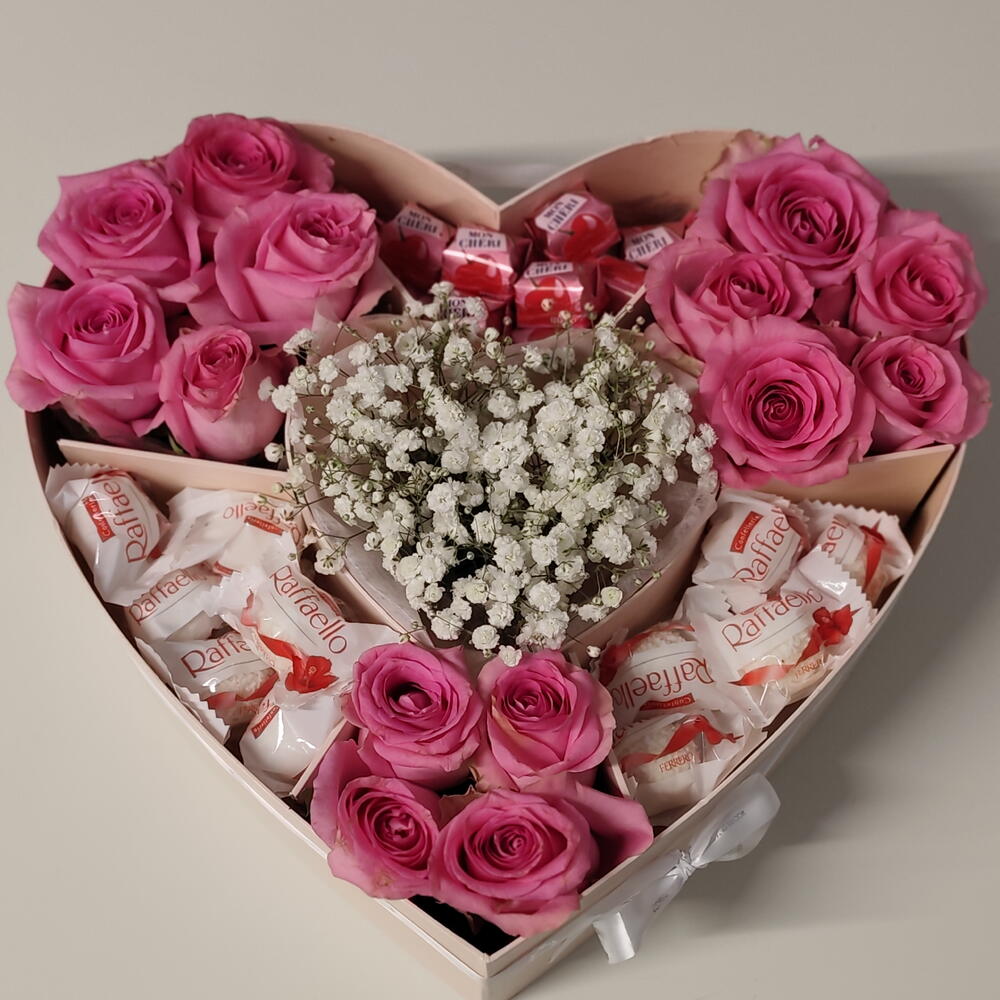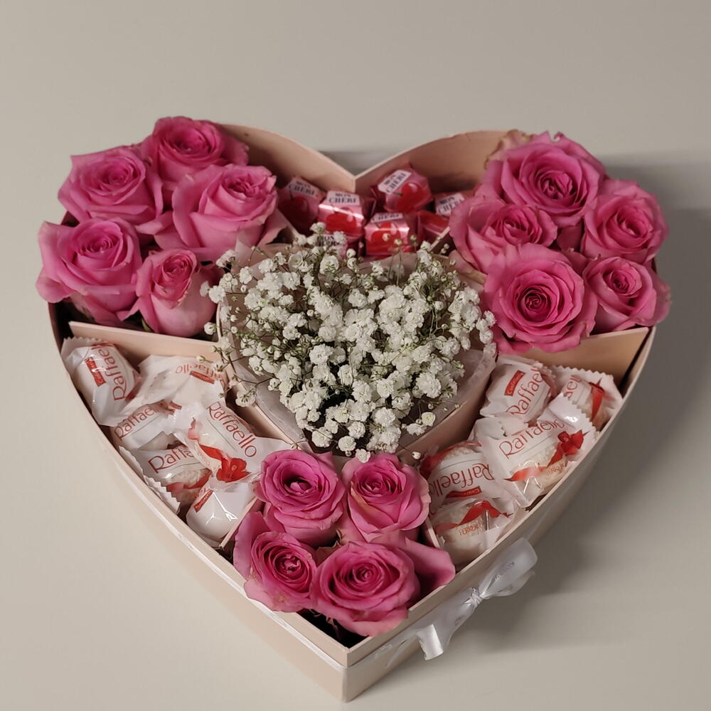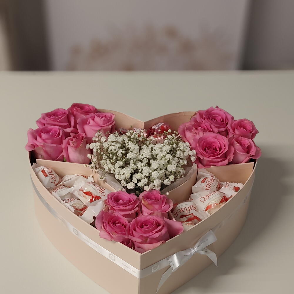 Diese liebevoll gestaltete Herzbox ist mehr als nur ein Geschenk – sie ist eine Botschaft voller Zuneigung. Zarte rosa Rosen treffen auf süße Raffello-Pralinen und feine Schleierkraut-Blüten und schaffen zusammen eine harmonische, romantische Komposition. Die edle Herzform macht dieses Arrangement zu einem besonderen Blickfang und eignet sich perfekt als Geschenk zum Geburtstag, Jahrestag, Valentinstag oder einfach, um einem geliebten Menschen eine Freude zu bereiten. Die frischen Rosen werden sorgfältig arrangiert und mit süßen Raffello-Pralinen und Mon Cheri kombiniert – eine wunderschöne Mischung aus Blumen und Genuss. Details: Frische rosa Rosen Feines Schleierkraut (Gypsophila) Raffello-Pralinen, mon Cheri Elegante Herzbox Handgefertigt mit viel Liebe zum Detail