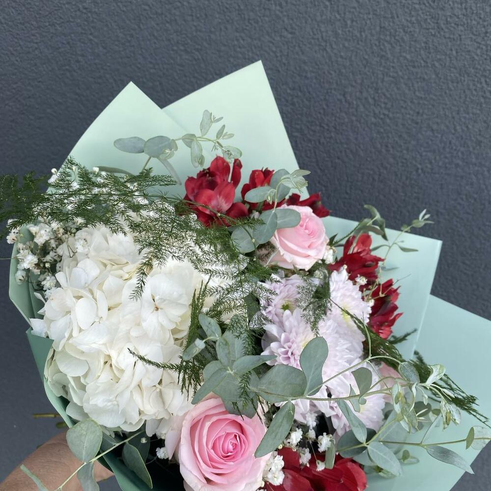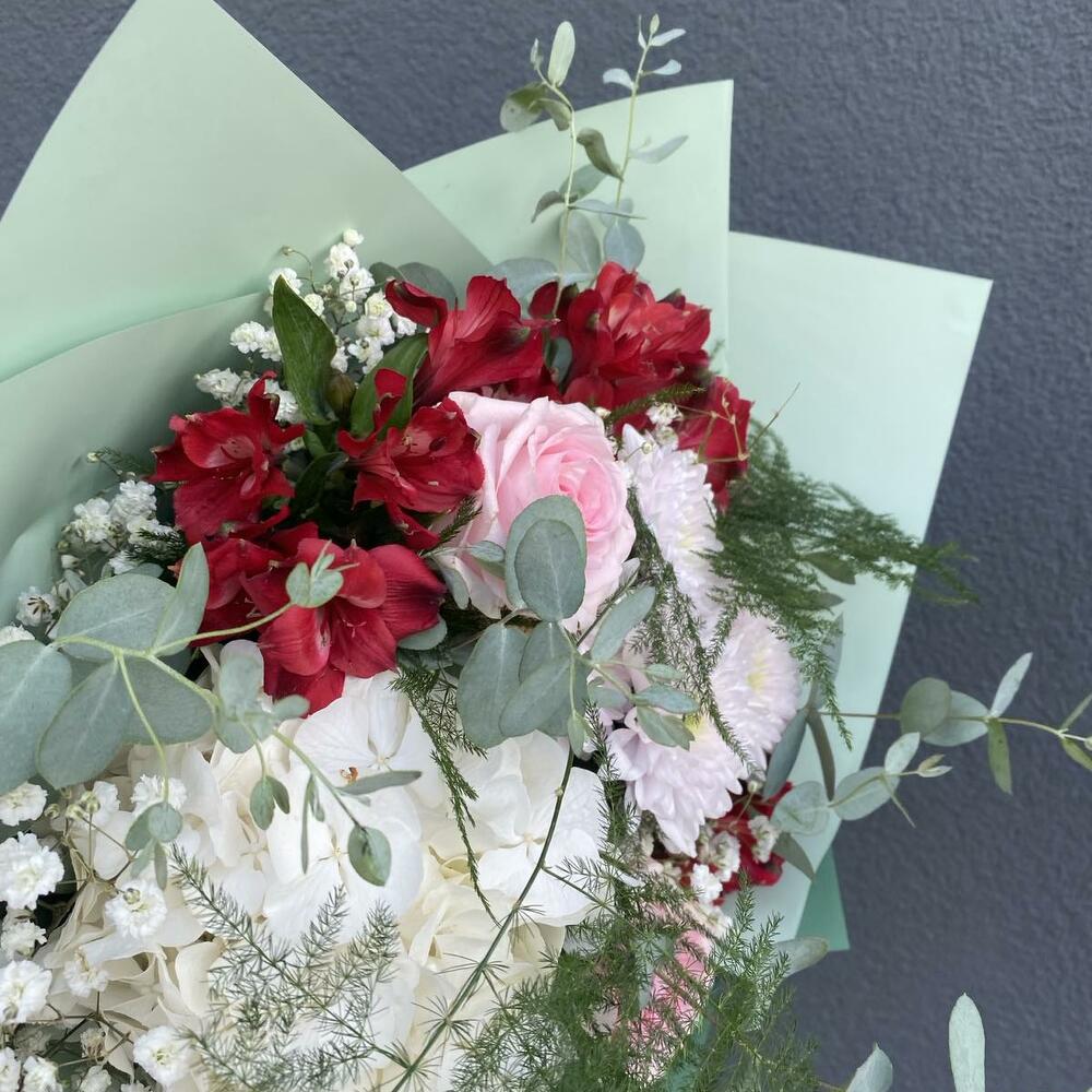 Eucalyptus - 3 pcs Greenery - 2 pcs Hydrangea - 1 pcs Chrysanthemum - 1 pcs Alstroemeria - 3 pcs Gypsophila - 2 pcs paper - 3 pcs roses - 3 pcs