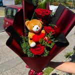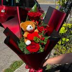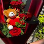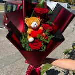 Wrapping - 1 pcs asparagus - 2 pcs hippericum - 2 pcs aspidistra leaves - 1 pcs teddy bear 20cm - 1 pcs red roses premium - 3 pcs hedera leaves - 5 pcs