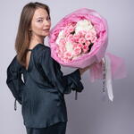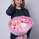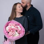 Букет красивый получился. Доставили немного позже назначенного времени, не критично для нас это было. Фото отчет сделали быстро. Доставка считаю дорогая, плюс большие розы не первой свежести были.