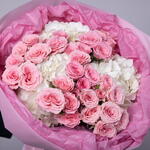 Spray roses, which differ from the usual huge number of petals, give the flowers volume and a magnificent shape. Hydrangeas, with their amazing beauty and power of the image, give the bouquet additional harmony and sophistication. Add to favorite to not lose! HOW TO CARE OF FLOWERS? Do not remove the wrapping paper from the bouquet, so then flowers will live longer Change the cold water in a vase every day Keep the vase clean Cut the stem of each flower every two days Keep the bouquet out of a direct sun, drafts and heaters Add the flower food 2-3 days after you’ve bought your bouquet (We add the flower food to every bouquet)
