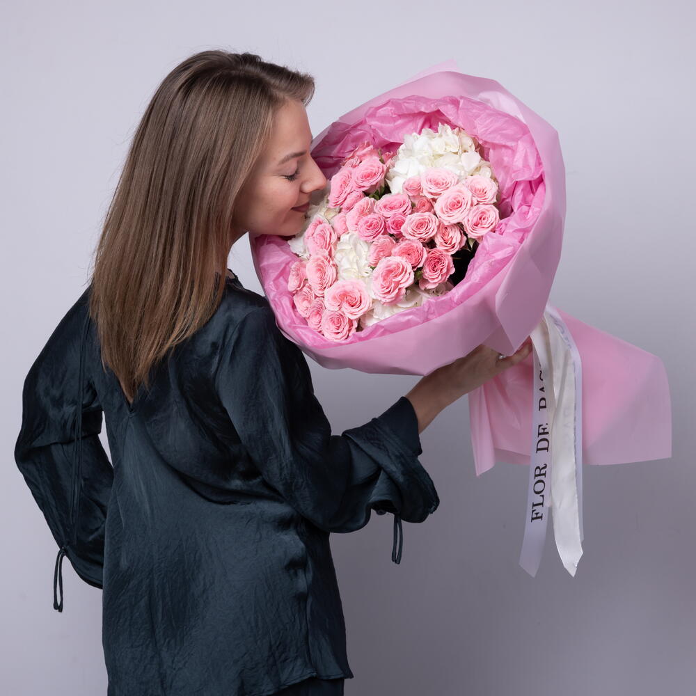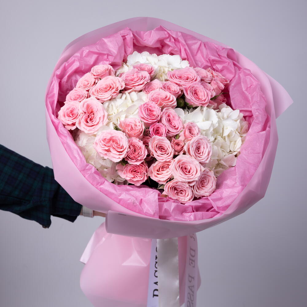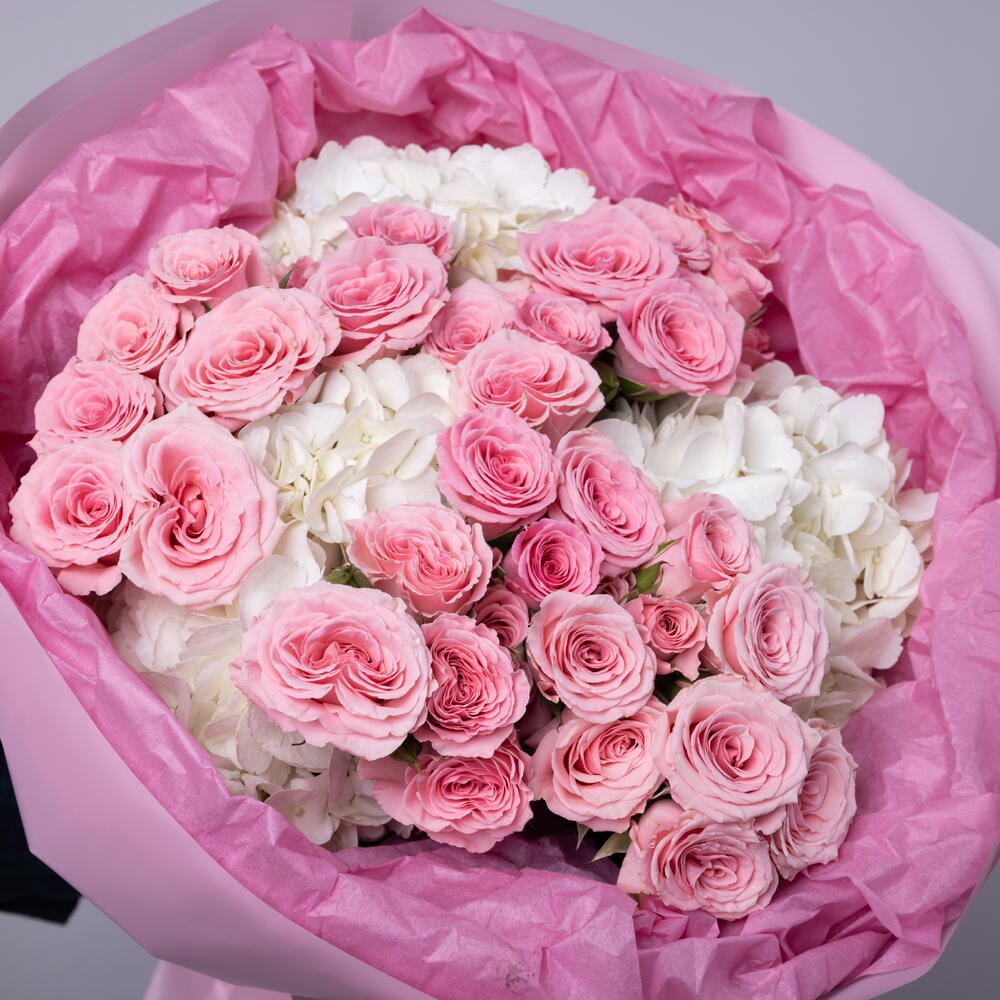 Spray roses, which differ from the usual huge number of petals, give the flowers volume and a magnificent shape. Hydrangeas, with their amazing beauty and power of the image, give the bouquet additional harmony and sophistication. Add to favorite to not lose! HOW TO CARE OF FLOWERS? Do not remove the wrapping paper from the bouquet, so then flowers will live longer Change the cold water in a vase every day Keep the vase clean Cut the stem of each flower every two days Keep the bouquet out of a direct sun, drafts and heaters Add the flower food 2-3 days after you’ve bought your bouquet (We add the flower food to every bouquet)