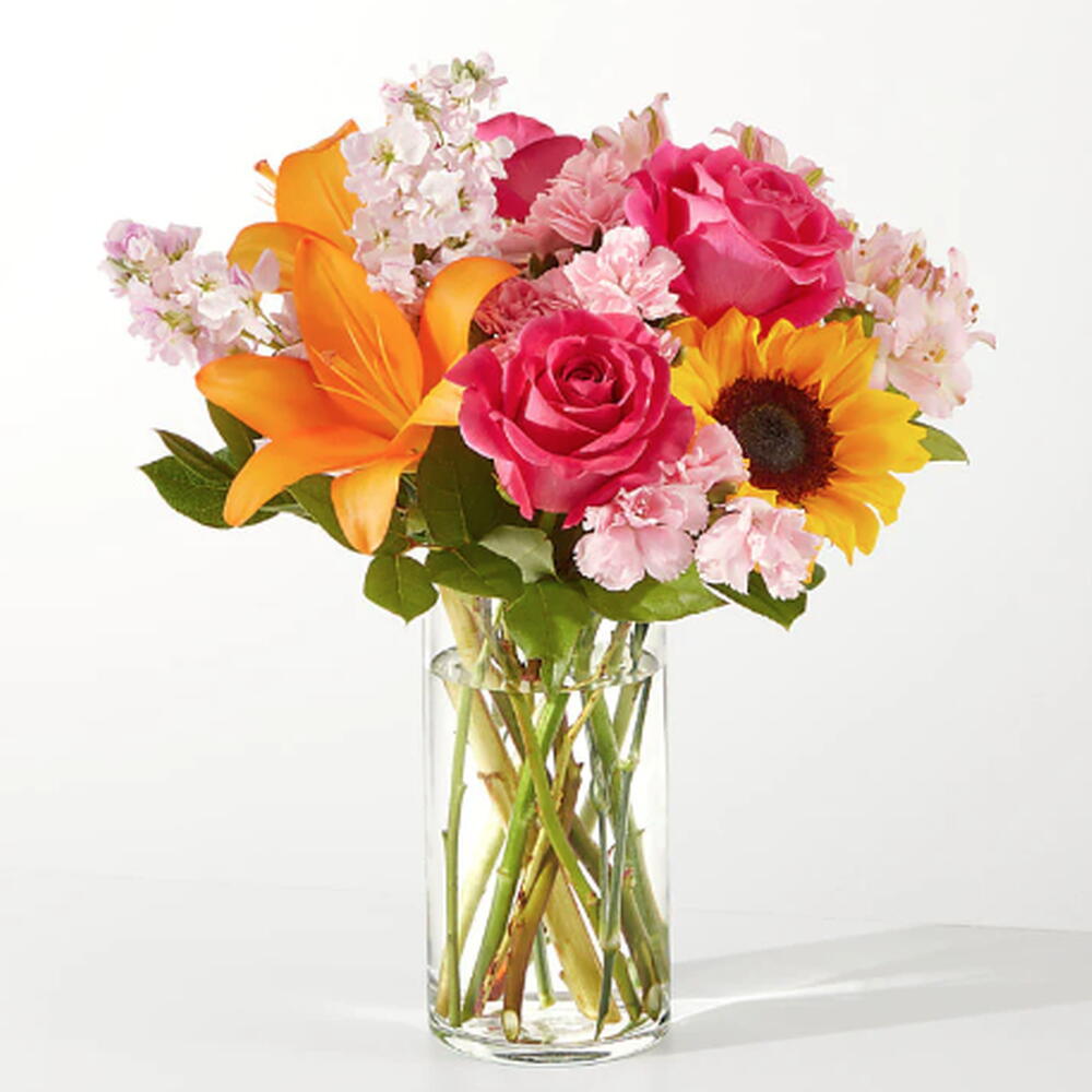 In Full Swing Bouquet (lily, rose, stock, sunflower + vase)