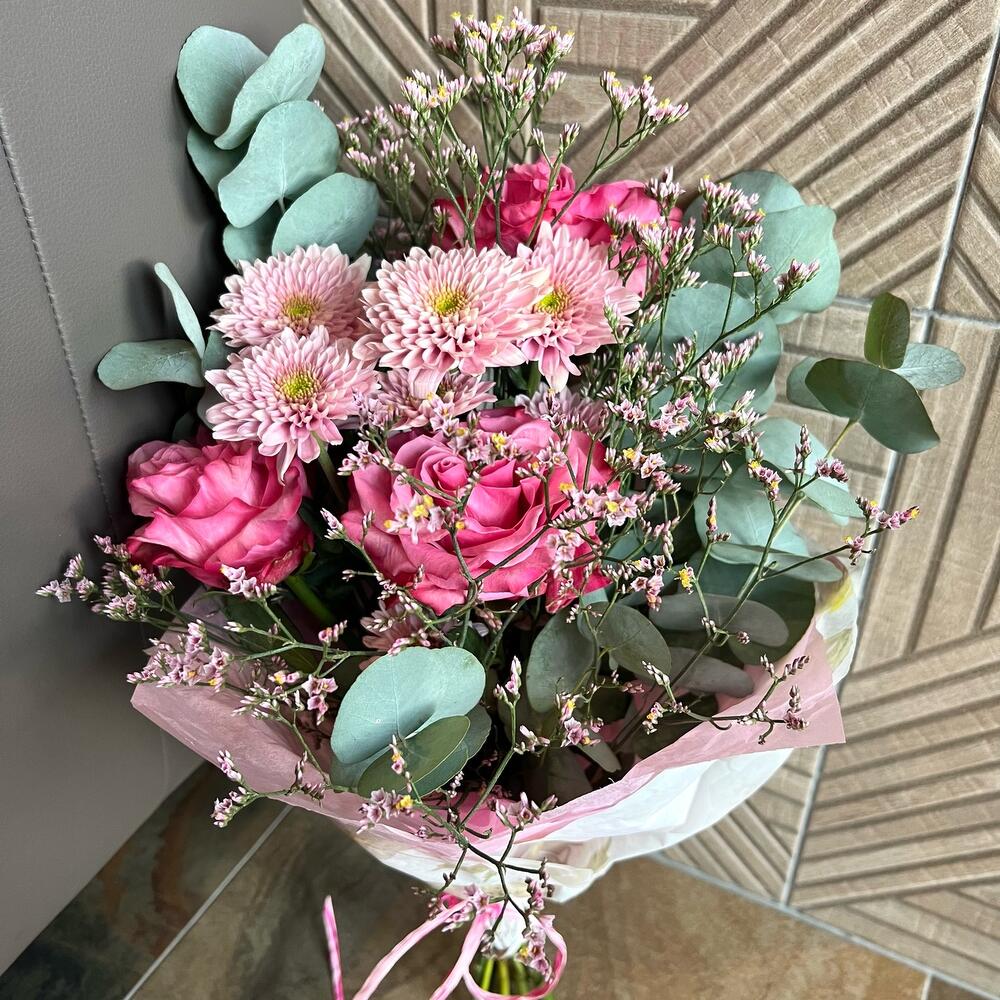 Limonium - 2 pcs Chrysanthemum - 1 pcs rosa ecuador - 3 pcs eucalyptus 2 - 3 pcs