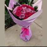 Ribbon - 1 pcs Ruskus - 10 pcs wrapping paper - 2 pcs pink roses - 9 pcs purple roses - 12 pcs